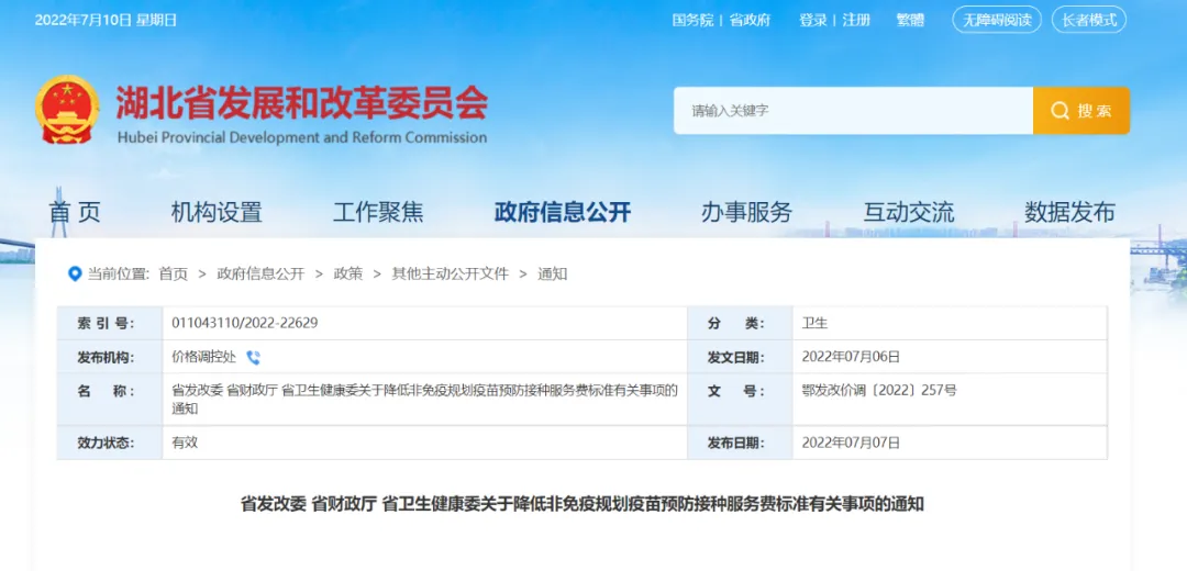 近日,湖北省发改委网站发布了《省发改委 省财政厅 省卫生健康委关于降低非免疫规划疫苗预防接种服务费标准有关事项的通知》。根据《通知》,7月10日起,湖北省非免疫规划疫苗预防接种服务费标准由之前的不超过27元/剂次,全省统一调整为20元/剂次。