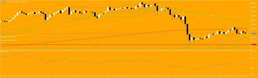 近期的黄金市场在高位展开拉锯战,价格在震荡中寻找方向。在4,360附近,敏锐的交易者发现了一个关键信号——一小时图布林带正在收口。