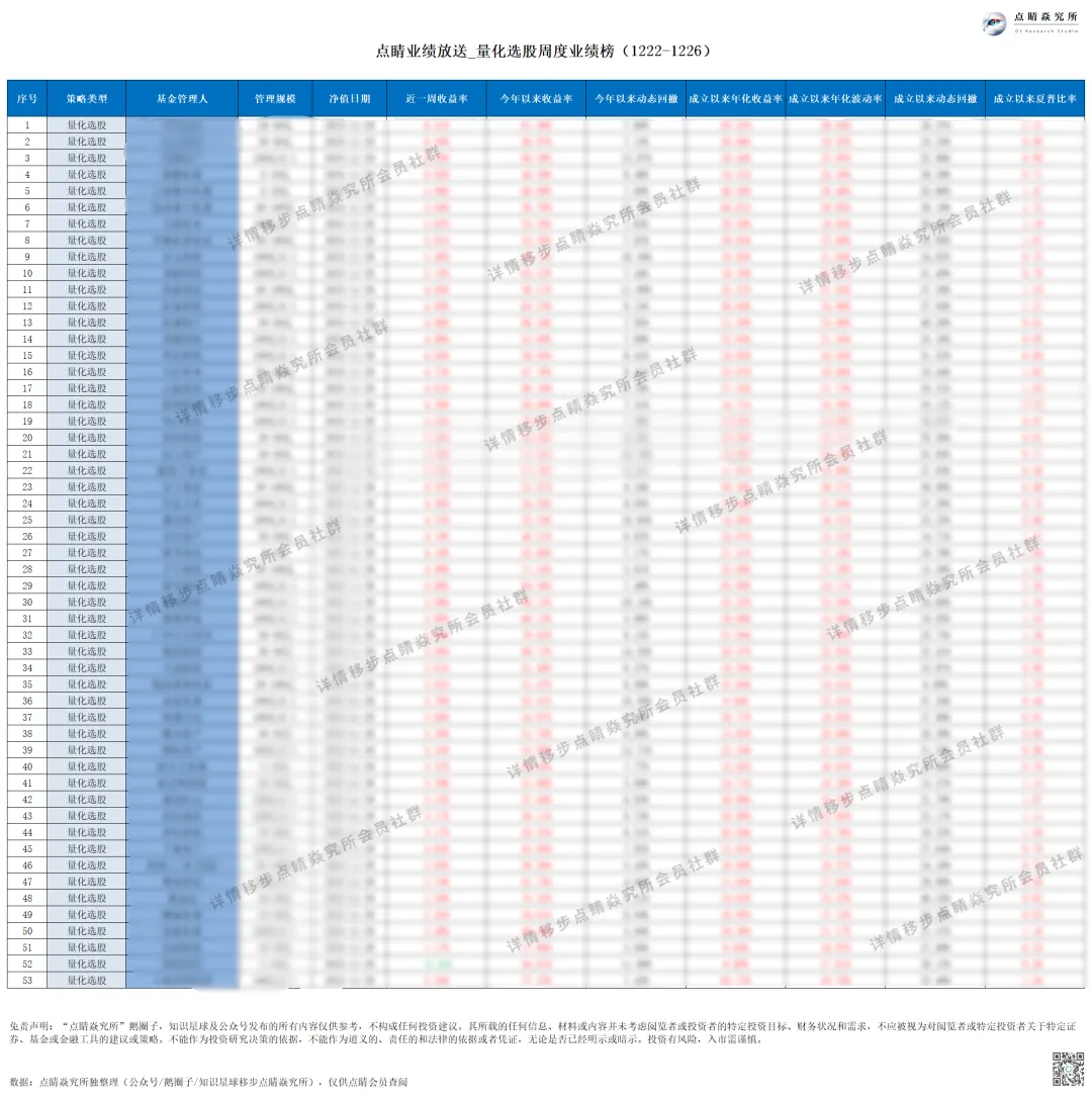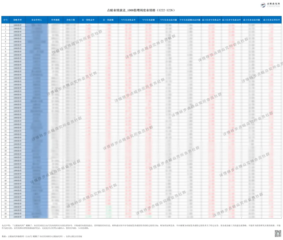 出于合规要求考虑,需要高清周度业绩数据详情的朋友们可以移步点睛会员圈自取哦,点睛会员圈于每周二准时更新全市场主要量化管理人业绩,欢迎关注。