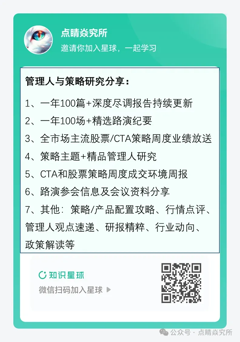 各位朋友,点睛已上线CTA策略与量化策略周度业绩放送更新与业绩解读点评栏目,建议关注并星标本公众号,以便及时获取最新资讯。