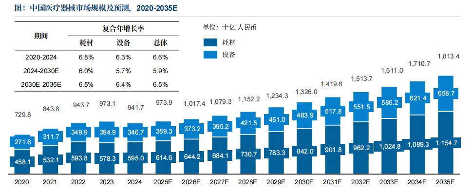 随着创新技术提升、人口老龄化加剧、慢病人群增多、医疗需求不断增加等因素,中国医疗器械行业继续保持较为平稳的发展速度,未来呈现增长趋势。根据弗若斯特沙利文数据分析,2020-2024年,中国医疗器械总体市场规模已从7,298亿元人民币增至9,417亿元人民币,CAGR为6.6%。预计到2035年,中国医疗器械总体市场规模将达到18,134亿元人民币。