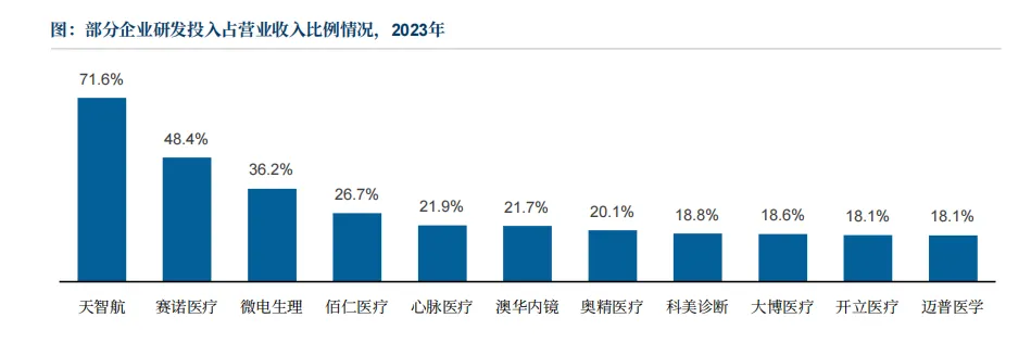 “十四五”规划提出加快高端医疗装备自主创新,支持国产医疗器械突破技术壁垒,政策上大力扶持中国医疗器械创新。近年来,国内医疗器械龙头企业研发投入占比逐年上升,接近国际同行水平。而技术密集型企业更是加大投入力度,不断推动行业技术进步,提升国产医疗器械的竞争力。如以骨科手术机器人及相关技术产品为主营业务的天智航,据2023年年报,公司研发投入占营收比例高达71.6%,并拥有328项有效专利。