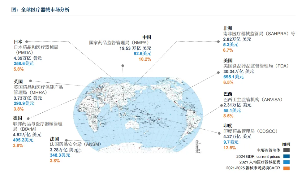 当前,全球医疗器械市场呈现稳步增长态势,市场规模持续扩大,覆盖领域广泛,地域分布呈现多元化特征。从市场格局来看,全球医疗器械市场已形成以北美、欧洲和亚太地区为核心的三大区域,各区域市场具有不同的特点和优势。