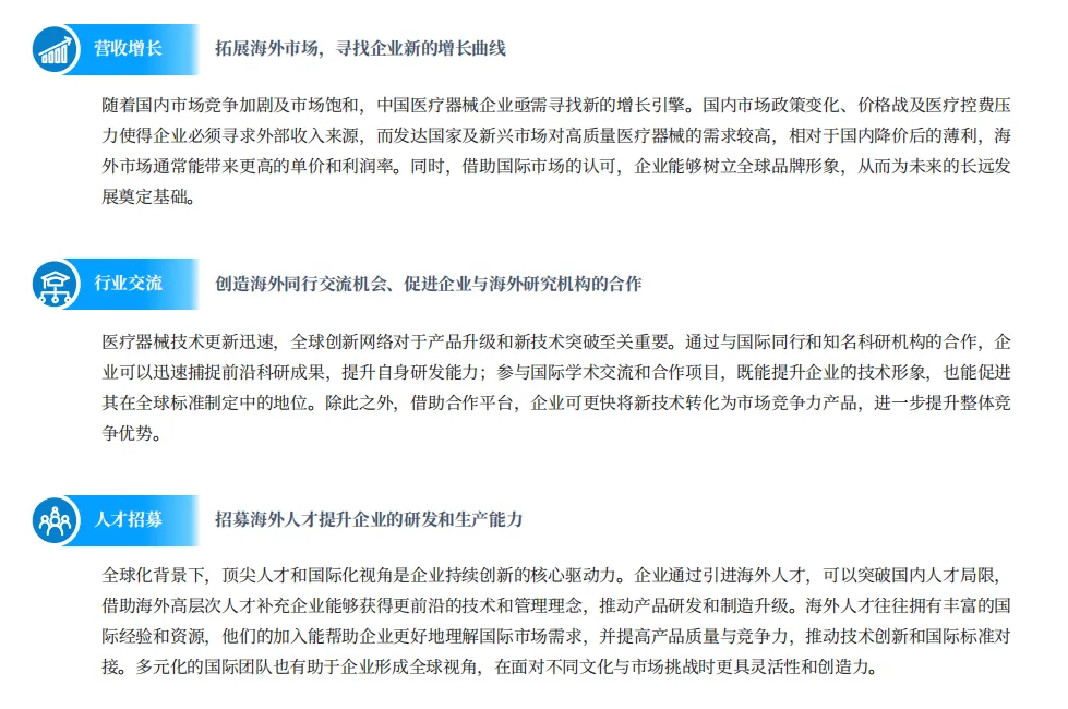 展会支持:中国从国家到地方层面持续加强医疗器械出海展会和对接平台支持。深圳市发改委打造“拓展国际市场”系列服务品牌,统筹央企、商协会和港澳资源助力本地医疗企业国际化。联影集团携高端影像设备参加阿拉伯国际医疗展展现中国科技实力,中国国际医用耗材大会及北虹桥出海对接会聚焦数字化转型和全球采购路径,助力企业产品海外商业化。系统化展会政策和资源对接机制为中国医疗器械企业出海提供持续有效的支持。