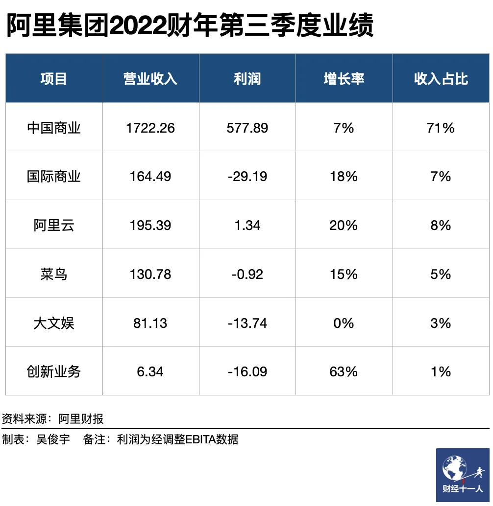 在这份财报中,阿里集团首次更新了分部报告结构,将现有业务划分六部分,中国商业、国际商业、本地生活服务、菜鸟、云业务、数字媒体及娱乐、创新业务及其他。财报显示,前三大收入贡献部门是中国商业、云业务和国际商业,分别占比71%、8%、7%,这三个部门也是增速最快的部门,分别同比增长7%、20%、18%。