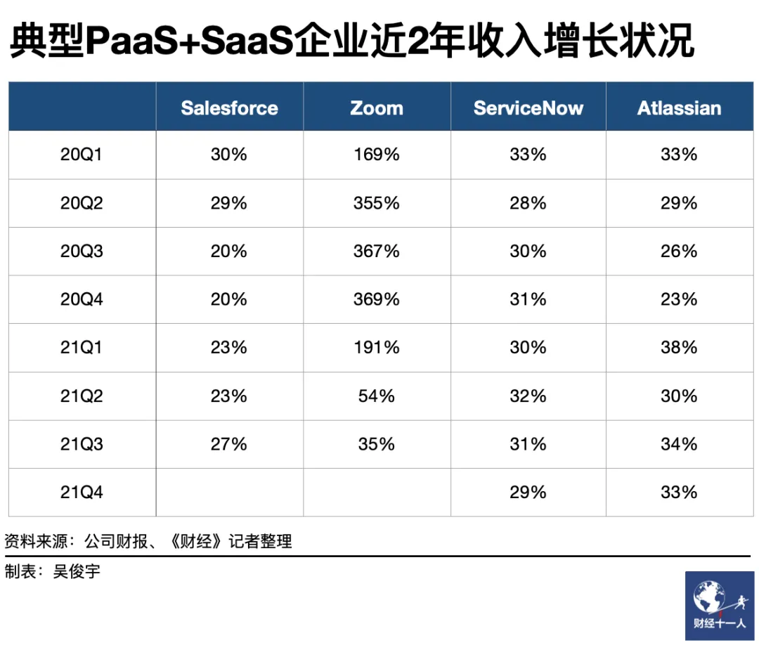 笔者统计多家海外知名SaaS、PaaS企业发现,其2021年业绩增速均接近或超过30%,如中Salesforce(客户管理平台,增速超25%)、Zoom(音视频解决方案,增速超60%)、ServiceNow(SaaS服务商,专注IT系统和流程管理,增速超30%)、Zendesk(客户服务类SaaS,增速超30%)、Atlassian(敏捷开发类平台,增速接近30%)。
