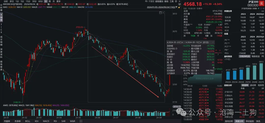 在2024年9月24日前后,A股突然爆发了一次快速的牛市行情,如上图所示,沪深300指数在10个交易日快速上涨了近35%。由于在9月24日上午有一个金融三部委的联合发布会,所以,市场把这波行情称为“924行情”。在通常情况下,市面上对“924行情”的解释偏宏观,大体的解释是,924之前投资者情绪偏悲观,但是,924前后的几个重要会议引爆了市场情绪。但是,基于宏观的解释没法解释两个微观细节:在这篇文章中,我们将为“924行情”构建一个基于微观逻辑的解释。对于小资金而言,“仓位暴露”根本不是一个问题,但是,对大资金而言,“仓位暴露”是一个极其严重的问题。在2024年1月的《雪球产品的困境和黑暗森林法则》一文中,我们曾经借助“雪球产品密集敲入风波”探讨过这个命题,如果大资金向整个市场暴露了自己的仓位,并且无法做出有效的应对,那么,这部分资金很容易被市场围攻。