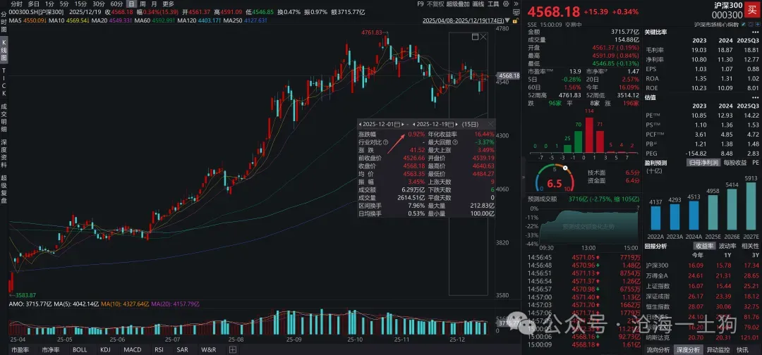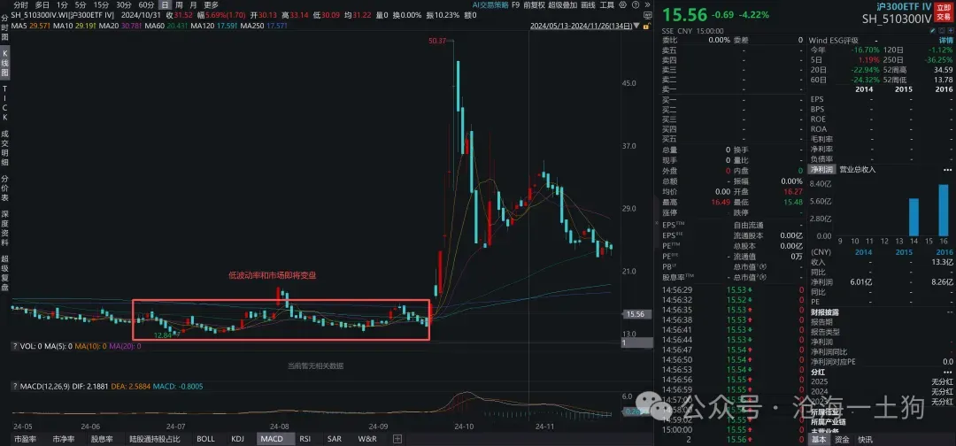 如上图所示,沪深300指数在2024年5月23日至9月13日震荡回落了14.25%。然而,2024年5月23日,头部四家300ETF的市值规模是5426亿(ps:华泰柏瑞、易方达、华夏和嘉实),到了2024年9月13日,其市值规模增长为7220亿。因此,在这个区间段内,资金的净流入额为(7220-5426)+5426×14.25%=2567亿。一方面是庞大的净流入体量,另一方面是沪深300指数不争气的表现。于是,就有不少人开始说风凉话,看,A股多差,主力资金买了2500亿都没啥用!!然而,我们考虑到了黑暗森林法则以及中性资金原理,就会意识到一点,924之前进来的资金都是中性资金,为了避免被套利资金狙击,他们必须用空单保护自己。因此,中性资金的介入并没有改变大势,指数该怎么走就怎么走。直到美联储“918”首次降息落地以及国内一系列重磅会议落地,大资金选择把假买入【确认】为真买入。因此,在924之后,市场的上涨极为局促,并且主要战场是衍生品市场。究其根本,是因为大资金早就悄悄布局进去了,他们就在等一个恰当的时机来完成确认动作。显而易见,相对于吭哧吭哧买2500亿的现货,确认动作要迅速很多。很多有经验的投资者都知道这样一个经验规律,当vix指数长期保持低位时,这意味着市场要变盘。然而,这个经验规律有一个bug,他无法告诉我们市场是向上变盘还是向下变盘。但是,中性资金原理弥补了这个bug:如果大资金构造的中性组合为【买入现货+卖空期货】,那么,潜在变盘方向为向上;相反,如果大资金构造的中性组合为【卖出现货+做多期货】,那么,潜在变盘方向为向下。根据中性资金原理,无论大资金进入市场还是撤离市场,都要分解成两个步骤:1、假买入/卖出;2、确认买入/卖出。无论是假买入还是假卖出,只要大资金在构造中性组合,市场的波动率就会不断地向下,即vix指数保持低位。直到某些增量因素促使大资金确认买入/卖出之后,市场要么升波上涨,要么升波下跌。于是,我们就能从波动率的角度看明白“924”的故事了,1、漫长的低波动率阶段,大资金构造中性组合,完成假买入;2、短促的升波阶段,大批量的大资金确认买入,波动率在短时间内炸掉。如上图所示,截至2025年12月19日,头部5家A500ETF的产品规模已经上升到1588.3亿(ps:华泰柏瑞、南方、华夏、易方达和国泰),整个12月规模已经增加了475亿。但是,在整个12月份,沪深300指数只是上涨了0.92%。跟去年924之前类似,ETF现货资金的大规模流入跟沪深300指数的涨跌并没有表现出明显的正相关。真正让大资金露出马脚的还是vix指数,如上图所示,11月25日之后,莫名来了一股降波力量,让vix指数连续大幅下挫,最终,vix指数持续地被压制在15.5附近。这意味着,中性资金在系统内大规模聚集。1、缺乏触发事件,假买入被逐步地撤销,中性资金消退,vix指数温和回升;2、触发事件落地,中性资金被引爆,假买入被连锁反应式地确认为真买入,vix指数剧烈上升;尽管小型的924行情不是一个必然,但是,我们能确认的是,在中性资金聚集的市场环境下,看空股市是极其愚蠢的行为。综上所述,我们就梳理清楚了“924行情”的微观机制,具备宏观显著性的资金不会像散户那样买卖。为了避免仓位暴露,他们会提前借助中性资金原理去构造一系列中性仓位,然后,静待触发时机的成熟。一旦时机成熟,他们会确认自己的中性仓位,而不是像很多人想象的那样——临时性的突击买入。事实上,不同的投资者处于不同的生态位,产生不同的行为模式。对于散户来说,中性组合毫无价值,一点意义都没有;但是,对于大型资金来说,中性组合是极其必要的,它进可攻,退可守,让主动权牢牢掌握在自己手里。所以,对普通投资者来说,换位思考才能产生价值,才可能发现新的规律。千万不要让自己陷入代表性样本偏差。对于整个金融学研究而言,中性资金是两种极其不稳定的特殊化合物,它们具备很好的研究价值。一种来源于买现货空期货,我们可以模仿化学的命名方式把它称为右旋中性资金;另一种则来源于卖现货多期货,对称的,我们把它称为左旋中性资金。在大多数情况下,左右的比例是对称的;在某些环境下,右旋中性资金堆积;在另一些环境下,左旋中性资金堆积。无论哪种中性资金堆积,都会导致vix指数持续低迷,以及酝酿潜在的升波行情,并且中性资金堆积得越多,潜在的升波行情越凶猛。最后,这两种化合物是两个关键的交通要道,它们可以把现货、期货、波动率以及利率等关键变量串联起来,构造一种变而未变的中间状态,让我们找到了一种“量变引起质变”的新范例。