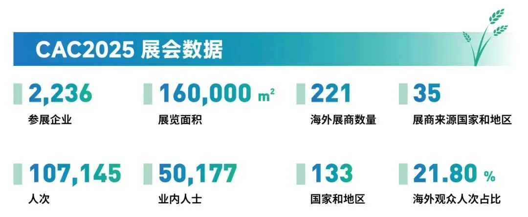 CAC2025展出面积16万平方米,汇集了来自阿联酋、澳大利亚、爱尔兰、奥地利、冰岛、波兰、巴西、秘鲁、德国、俄罗斯、法国、韩国、荷兰、美国、马来西亚、南非、日本、斯洛伐克、瑞士、土耳其、泰国、乌拉圭、新加坡、西班牙、印度、印度尼西亚、越南、英国、以色列、意大利、约旦、智利、中国香港、中国台湾等35个国家和地区的2,236家企业参展。展会吸引了来自133个国家和地区107,145人次的业内人士汇聚上海,有力促进农化行业的贸易交流与发展。