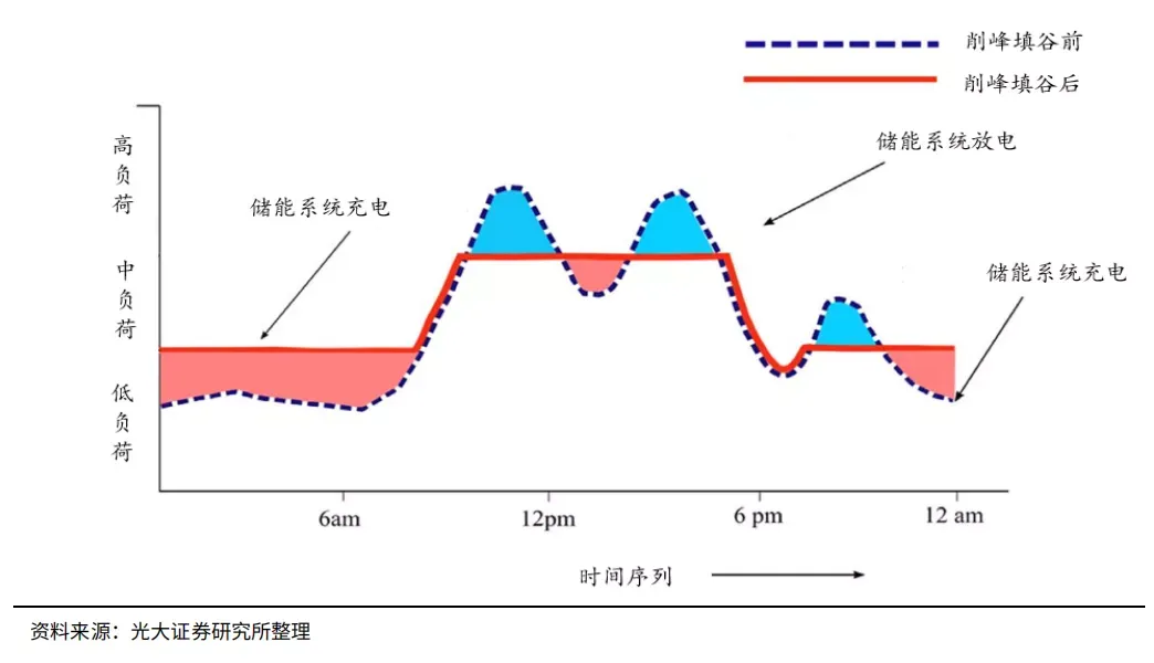 通过储能技术应用,就可以起到到削峰填谷的作用,简单来讲就是均衡充放电,从而达到稳定供电效果(原理如下图所示)。