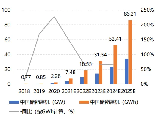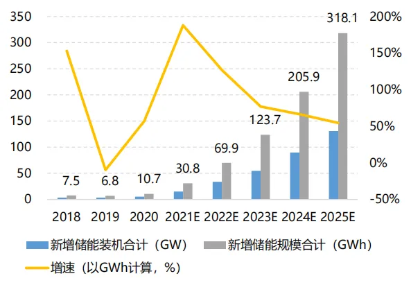 根据东吴证券的测算,预计到2025年国内新增储能装机达到34.4GW/86.2GWh,2021-2025年复合增速为84%;到2030年国内新增储能装机达到175.6GW/534.4GWh,2021-2030年复合增速为61%,国内储能市场占全球市场的1/3左右。