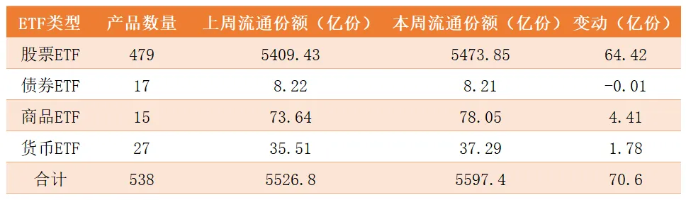 再说回本周的ETF市场情况,截至8月13日,全市场共有538只ETF跟踪335只指数,场内流动基金份额5597.4亿份,相比上周增加70.6亿份,如下图所示: