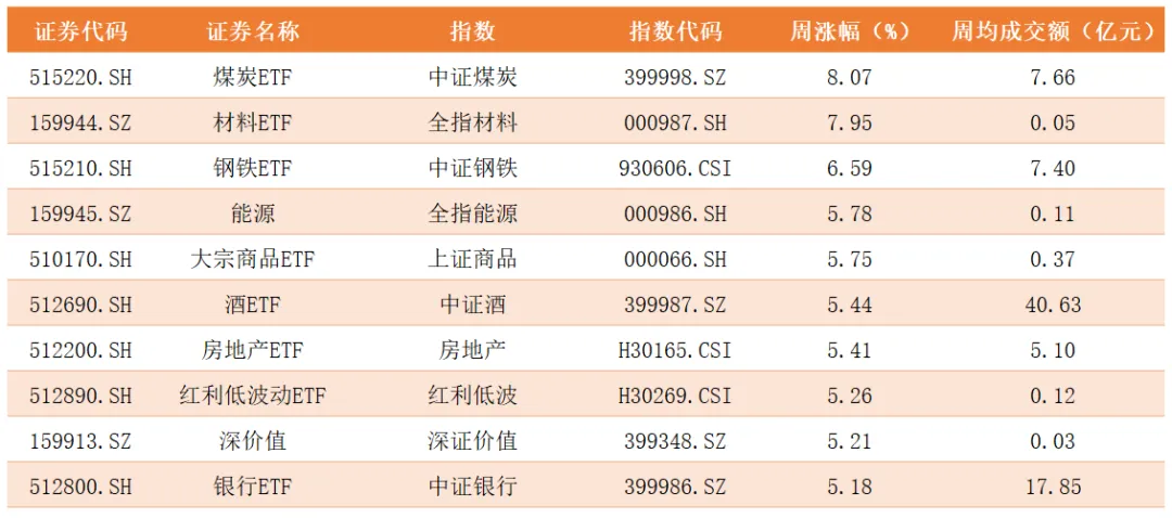 本周ETF上榜标的主要由两大方向构成,一方面是传统资源板块,代表产品煤炭ETF、材料ETF、钢铁ETF等;另一方面是在低估值三傻的强势上涨带动下,价值派代表地产、红利、银行全面上涨,详细数据如下: