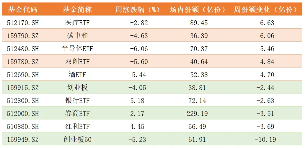 本周权益类ETF净流入64.42亿份,其中半导体ETF、碳中和、医疗ETF份额增长超过5亿份;份额流出方面,本周涨幅靠前的红利、银行等ETF份额减少较多,详细数据如下: