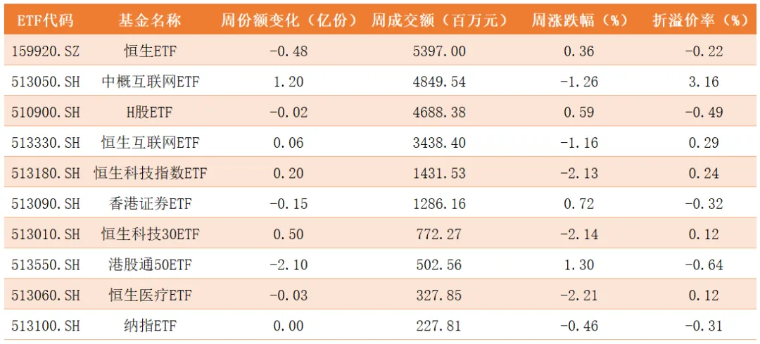 本周跨境ETF涨跌互现,其中港股科技类、生物医药类标的跌幅较大,其余产品小幅波动,份额方面港股通50ETF减少2.1亿份,其余变化不大,成交额排名前十的标的如下所示: