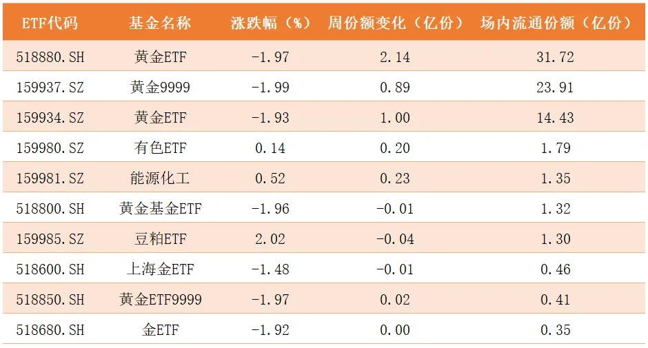 商品ETF本周出现分化,黄金ETF集体下跌约2%,豆粕ETF、能源化工和有色ETF分别上涨2.02%、0.52%、0.14%。份额方面,除黄金ETF增加2.14亿份以外,其余标的变化不大,详细数据如下所示: