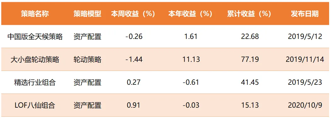本周四只策略表现不一,其中大小盘轮动和全天候小幅收绿,精选行业、LOF八仙组合收红,值得一提的是大小盘轮动策略成功避开了本周创业板回调,这正是轮动策略的优势所在,上涨时跟得上,下跌守得住。