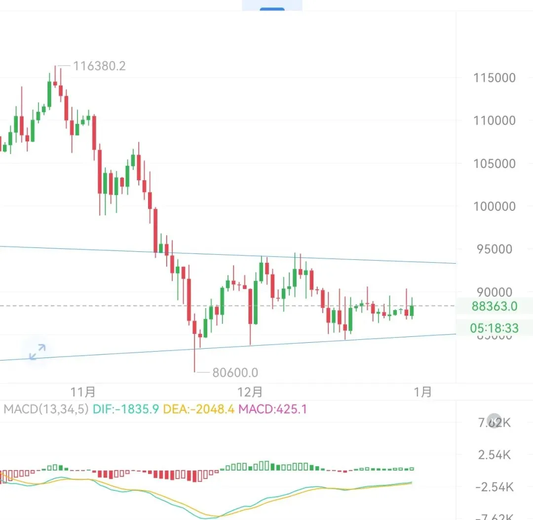 跨年第一炮,行情冲高至89500附近后,回落至88000附近震荡。日线级别哆头依然比较强势,只要价格不再跌破87200则大概率会配合节日来一波小突破。同时四小时量能也是在逐渐递增。说明哆头在逐渐加码。为后续突破蓄力。所以晚间依然回调哆为主。