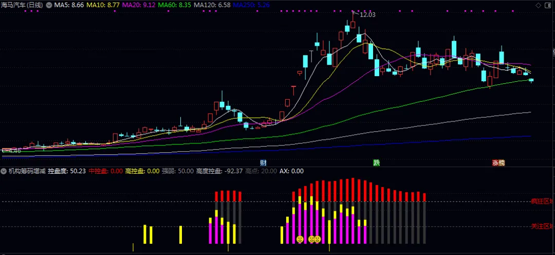 ‑ 紫/橙堆:短期对倒剧烈,出现“关注区”图标 ⚠️
