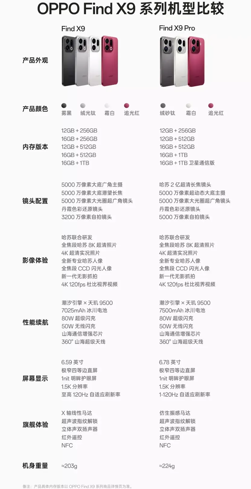 附上官网列的Find X9和Find X9 Pro主要配置对比表,【Find X9】12+256GB版售价4399元,12+512GB版4999元,16+256GB版4699元,16+512GB版5299元,16GB+1TB版5799元;【Find X9 Pro】12+256GB版5299元,12+512GB版5699元,16+512GB版5999元,16GB+1TB版6699元(卫星通信版后续上市),有入手的吗?