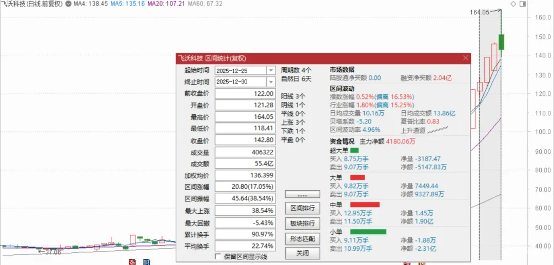 昨天大盘练成9阳神功后,今天微跌,破了金身。昨天盘口指数收红就走的艰难,于是今天就有回踩的预期。但日内看,这走势还是强,大盘差一丢丢走出10连阳,现在趋势又走出来了,短线有回踩空间也不大。明天就是25年最后一天了,能否再拉个大阳线收尾?拭目以待!个股这几天还是下跌的较多,资金聚焦主线方向,踩不对方向也是很难赚钱!量能2.16万亿,基本保持没变,2万亿上方,市场就还有活跃机会!对于航天IPO新概念,今天虽然部分兑现,但总体还是强的,周一咱们第一时间就给大家挖掘了一波,第一天差不多十多只,10%+,今天没涨的开始补涨:虽然没卖到最高160+,但四天涨幅也有20%左右。恭喜收获的朋友。今天再次进场一个芯片标的,跨年2号,今天直接板了,介入还看明日了。希望关注成本不要太高就好了。再简单聊下盘面,