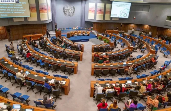 二是仪式感,而且是不靠压迫感的仪式感,传统大会的仪式感,往往来自轴线,正中,压低环境光,抬高舞台高度,但这里的仪式感更像是一种聚合感,所有人被一个圆心所吸引,却并没有被强制地压向一个点,这种感觉更克制,也更现代。这个可以参考联合国开会的形式。