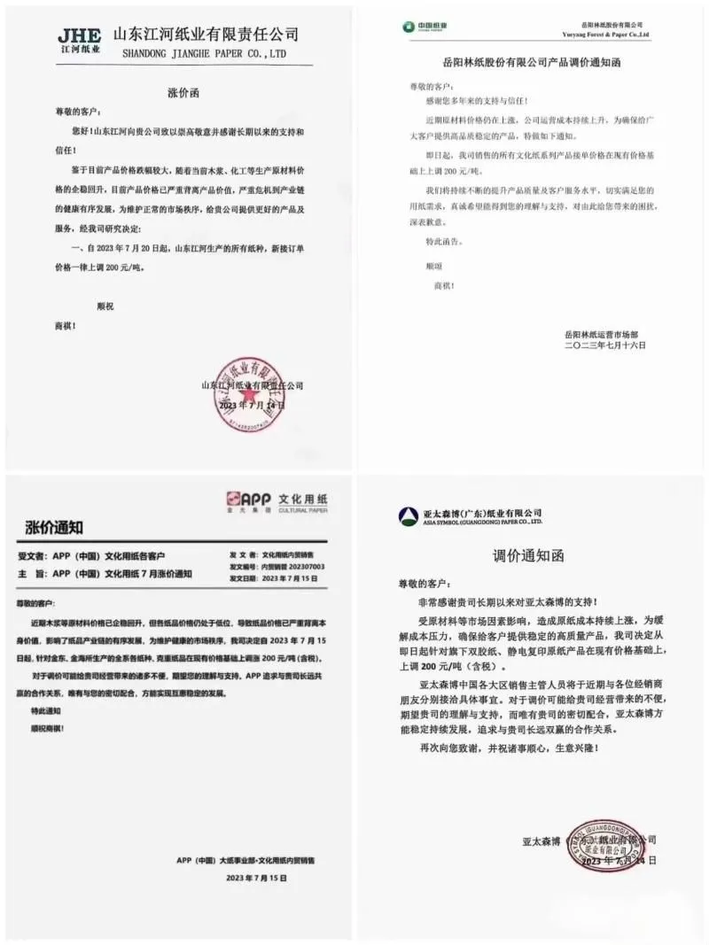 纸引未来网讯 需求疲弱,行情低迷,各类原纸价格的走势表现不同。7月18日-7月20日,文化纸市场惊现多份涨价函,单次涨幅高达200元/吨。然而包装纸市场却依旧维持低位运行,龙头纸厂再度宣布旗下多个基地下调部分原纸价格,降幅为30-100元/吨。