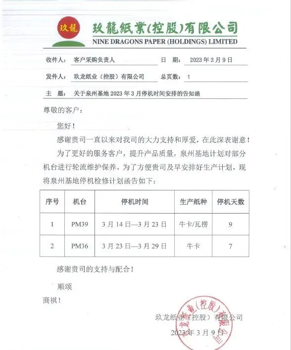 3月9日,玖龙纸业宣布泉州基地两台纸机将从下周起轮停检修,按照设计产能计算,预计减产箱板瓦楞纸1.5万吨。