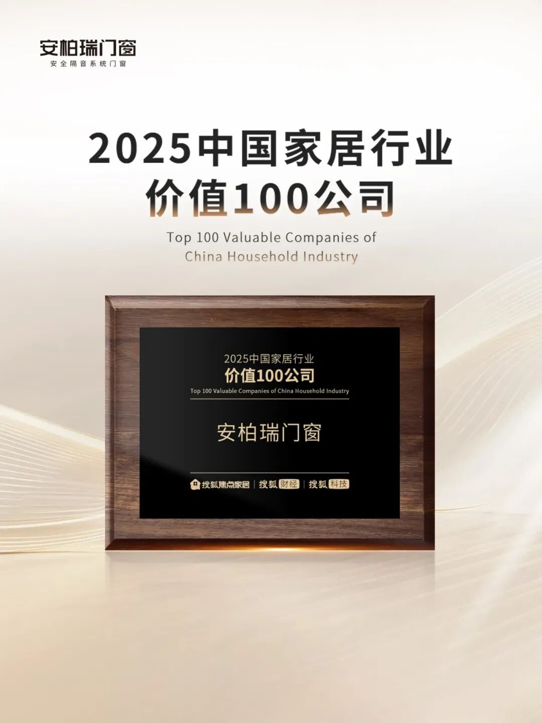 近日,由搜狐集团发起、权威行业协会指导、搜狐焦点家居主办的“2025中国家居行业价值100公司” 评选结果重磅发布。安柏瑞门窗凭借在整家定制领域的综合实力,经线上投票与专家评审双重认证,最终荣获“2025中国家居行业价值100公司”。