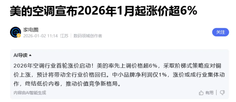 节前,就有消息称:某三线品牌空调开始涨价了。紧接着又出现铝代铜的消息。这不刚过元旦,美的空调也宣布涨价了。