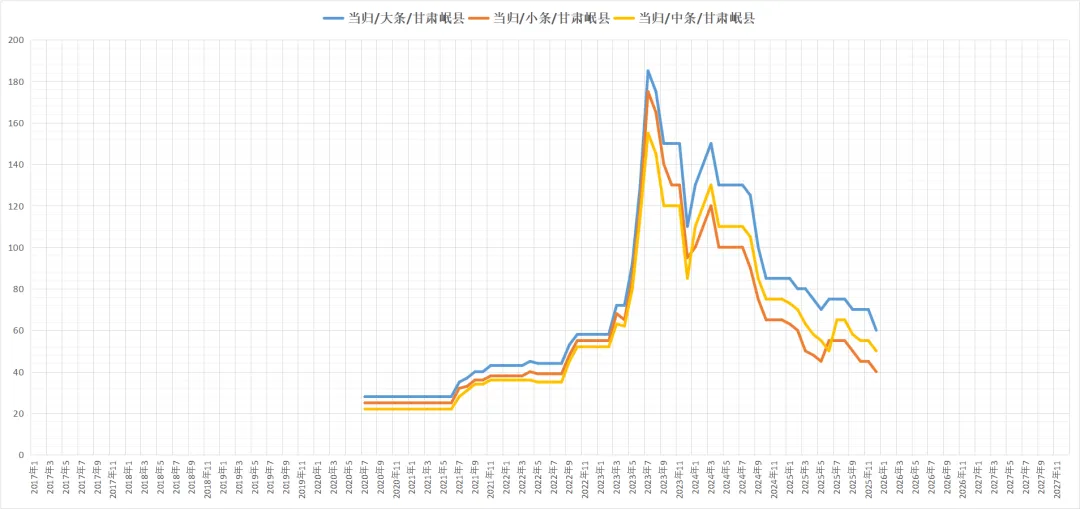 今日当归上货量有所减少,大约有125-135吨货源出售;成品、水洗货有40车货源出售。市场人流量不大,要货客商不多,本地加工户采购茬色好的小条、小中条货源,要货力度不大,少量经营户围观商量长条货、药厂货,成交货源少;采购商要货时较为谨慎,给价低,货主让步空间小,交易略显僵持。整体购销迟缓,成交价格基本稳定。今日成交量占总上货量的15-20%之间。当归药厂成交价格30-33元/kg之间;当归小条成交价格35-40元/kg;当归中条成交价格在43-48元/kg;当归大条(条形好)成交价格在51-56元/kg之间;当归特大条(条形好)成交价格在62元/kg左右。以上价格仅供参考,具体以实际成交价格为主。