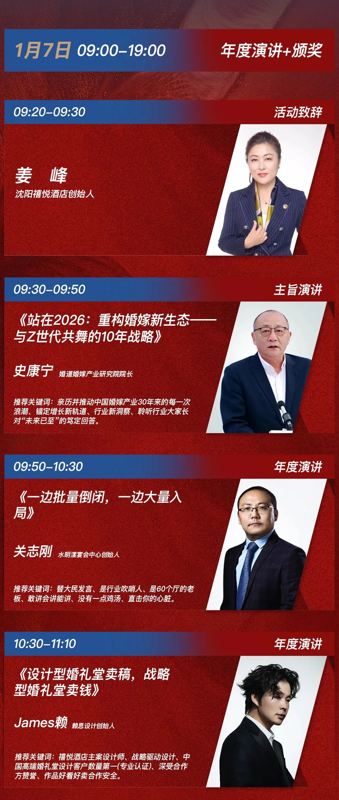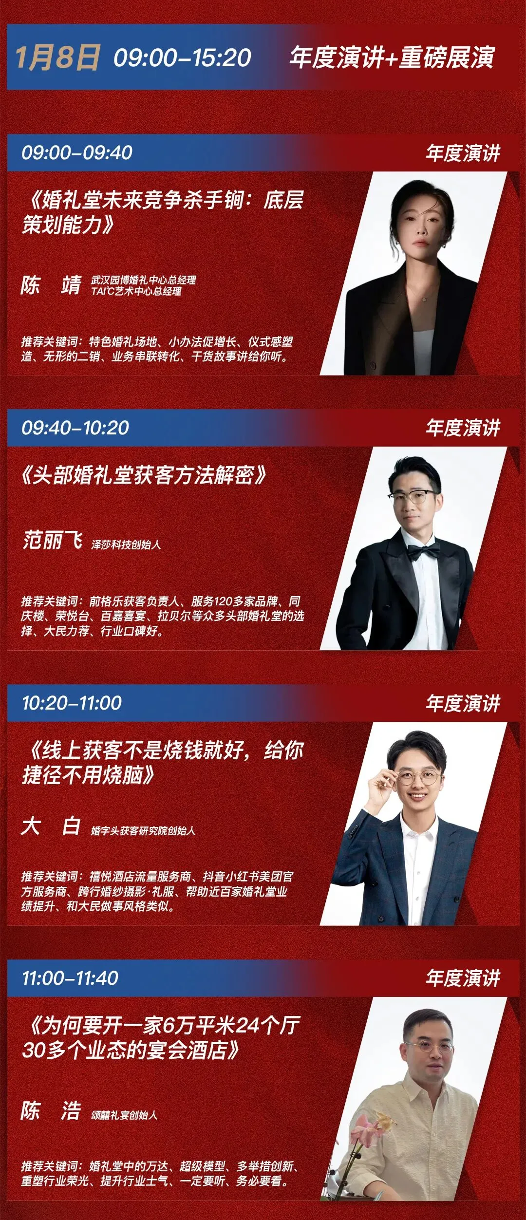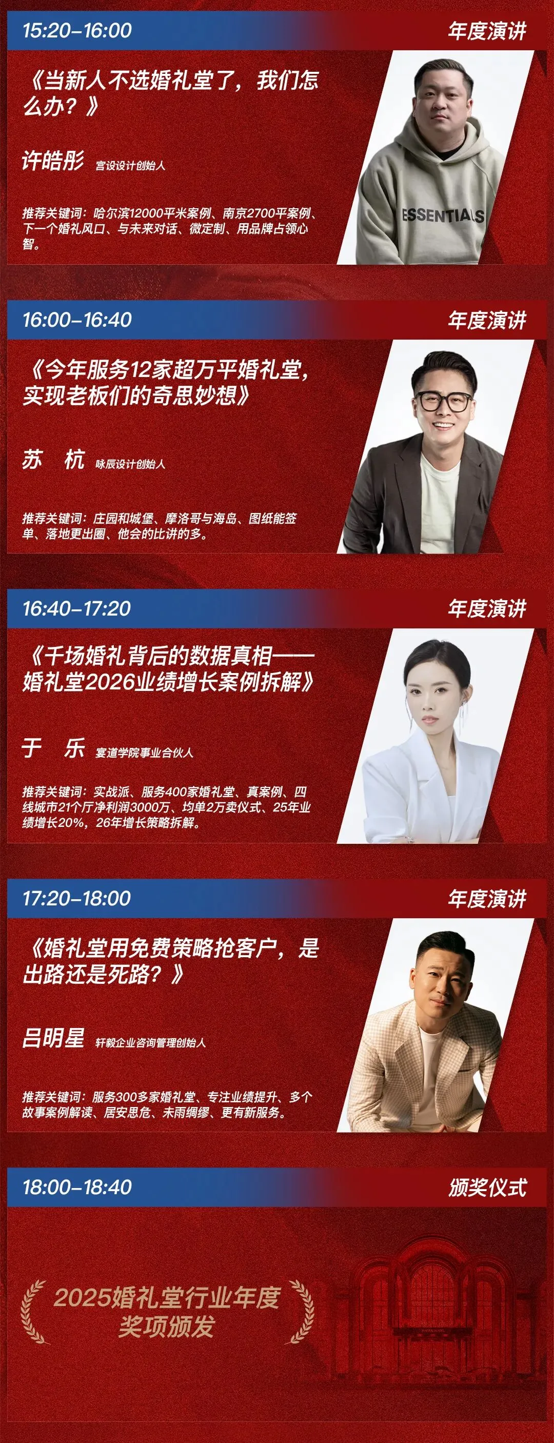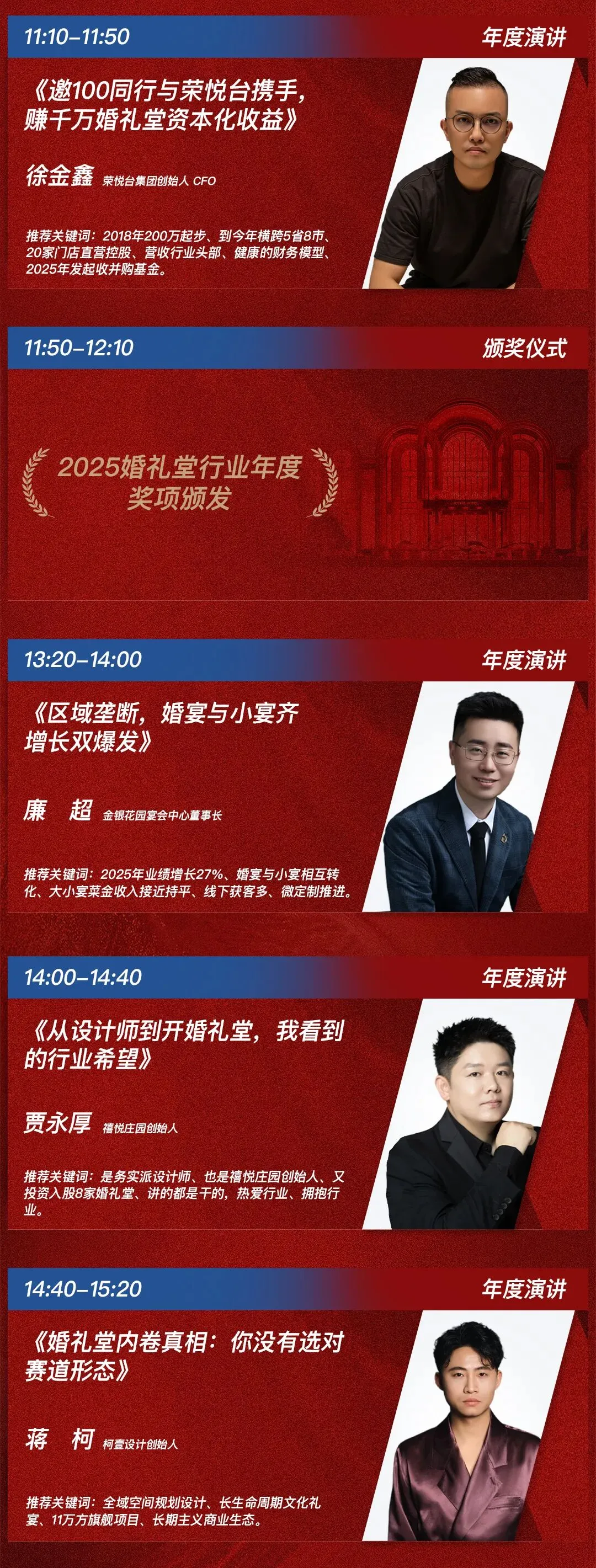 三、内容亮点——《2025婚礼堂行业年度演讲》,将由20位特邀嘉宾一一呈现,从当下话未来,从趋势到创新,13个小时的观点输出,给您带来足够深刻、深厚、深度的思想碰撞。