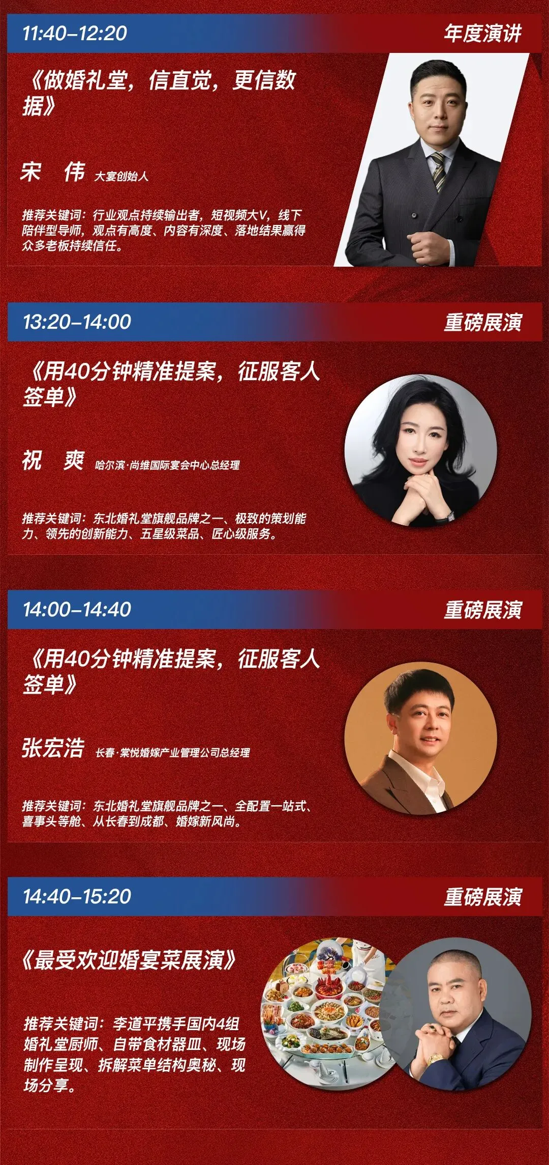 特别推荐:8日下午重磅——两家东北婚礼堂旗舰品牌《40分钟精准提案》展演+李道平携手国内4组婚礼堂厨师团队《最受欢迎婚宴菜》压轴展演。