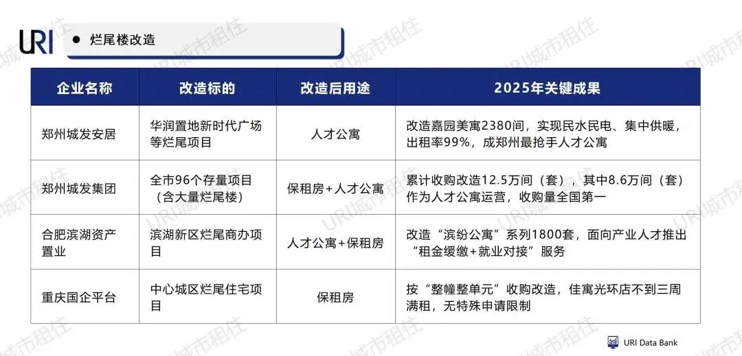 2025年,烂尾楼改造成为保障性住房重要来源,多地国企主动承接烂尾项目,通过收购、盘活、改造,将停工楼盘转化为人才公寓或保租房,既助力“保交楼”,又补充租赁房源,形成“救市+保障”双赢格局。郑州城发安居开创大规模烂尾楼改造的“郑州模式”,成为行业标杆。