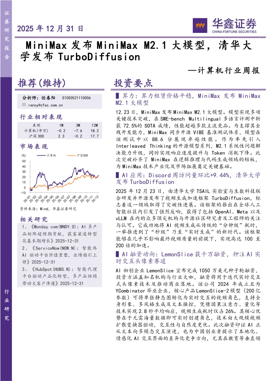 1. 算力领域:算力租赁价格平稳;12月23日MiniMax发布M2.1大模型,该模型在SWE-bench Multilingual多语言评测中获72.5%的SOTA成绩,在其开源的VIBE基准测试体系中得88.6分;模型引入Interleaved Thinking,提升响应速度、降低Token消耗,补齐逻辑推理与代码生成短板,为技术产业化奠定基础。