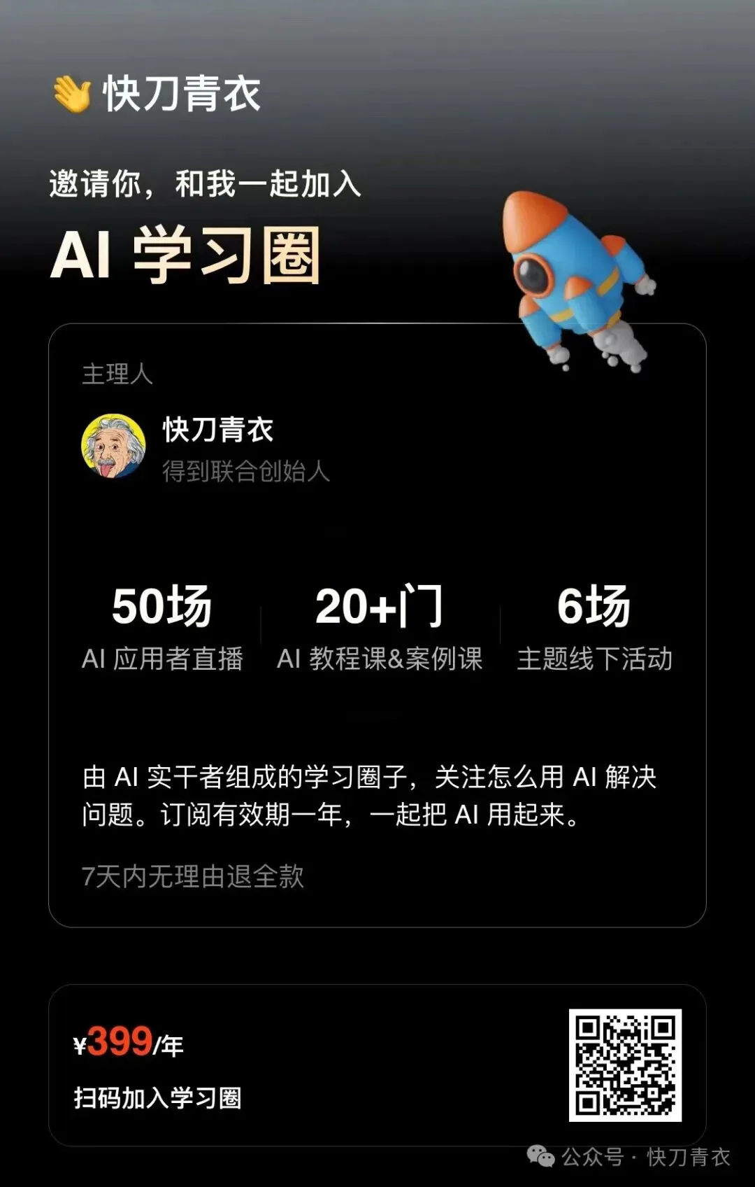 所以在1 月底,我在得到上线了一个内容产品,叫“AI 学习圈”。里面包括每天 1 篇的免费内容更新,嗯,是日更内容,365 天不停,今年是 366 天。另外还有一些订阅用户专享的视频教程,例如 AI 写公文啥的,感兴趣的话可以去看看。