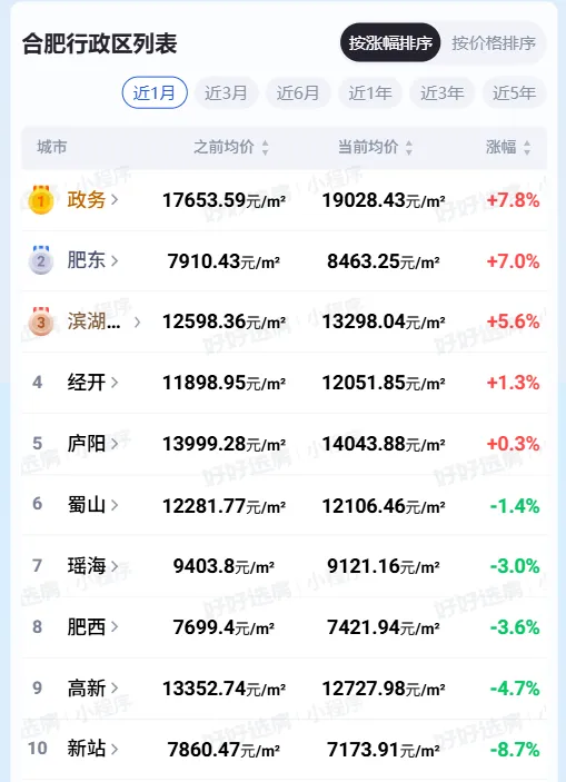 另外,政务和肥东的房价涨幅分别是第一和第二位,涨幅为7.8%和7%。