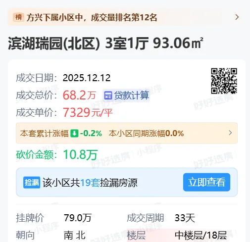 滨湖瑞园北区93平户型,成交单价7329元/㎡。
