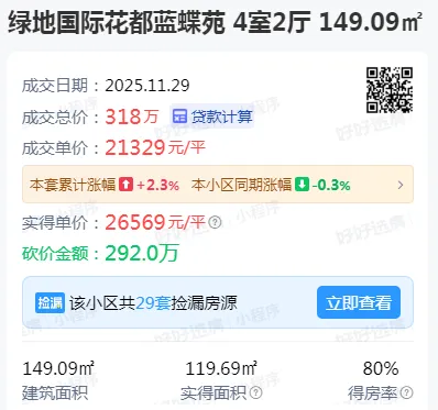 绿地国际花都蓝蝶苑149平户型,成交总价:318万元,成交单价21329元/㎡。