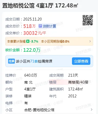 置地栢悦公馆172平户型,成交总价:518万元,成交单价30032元/㎡。