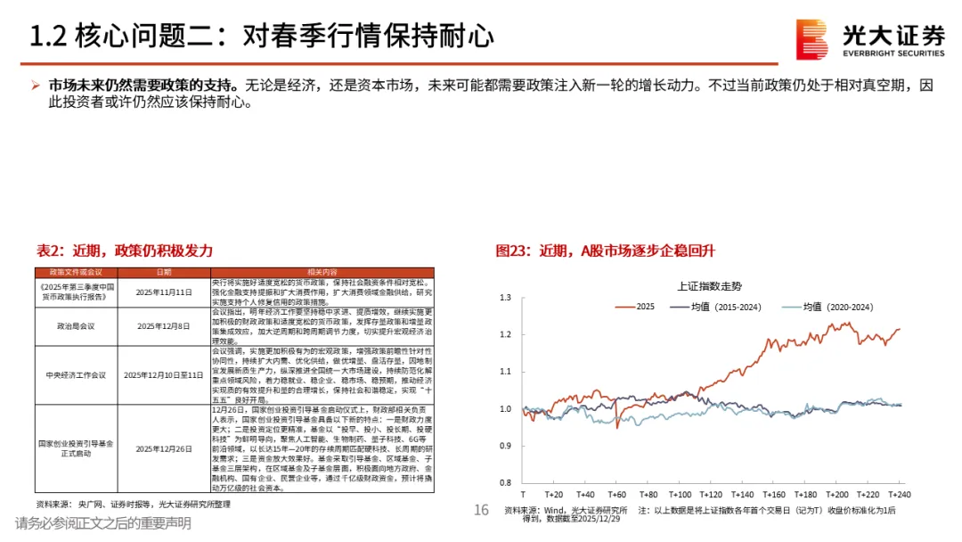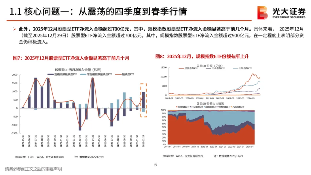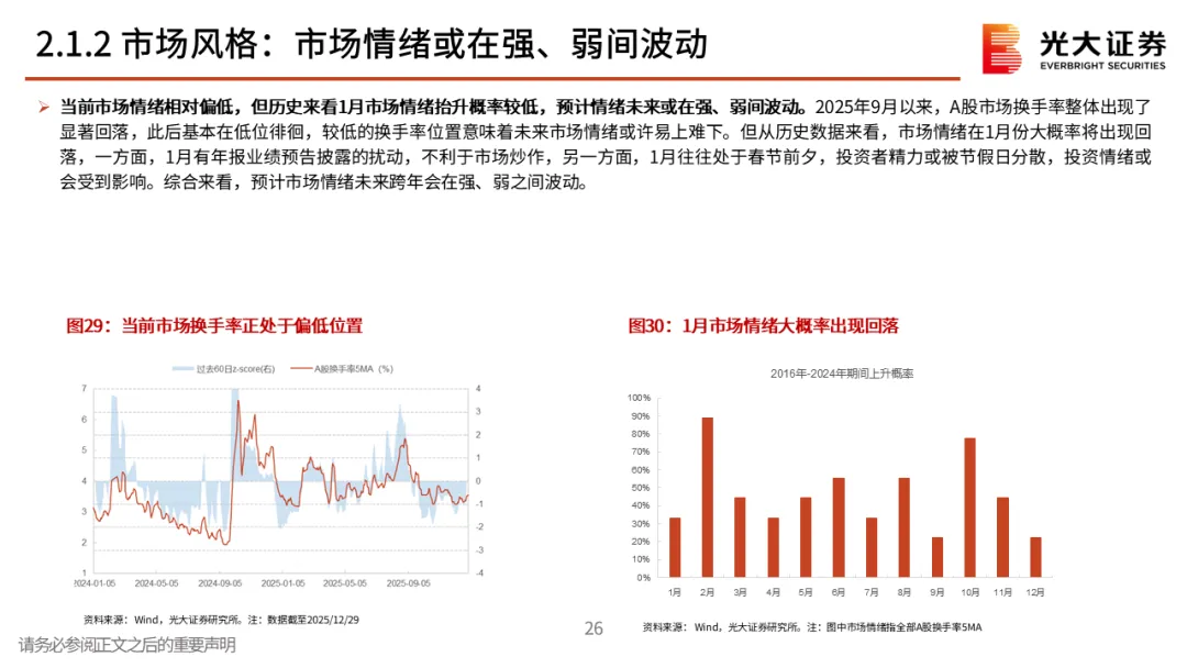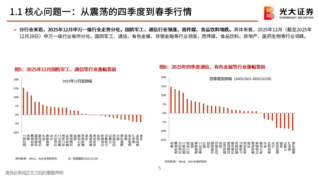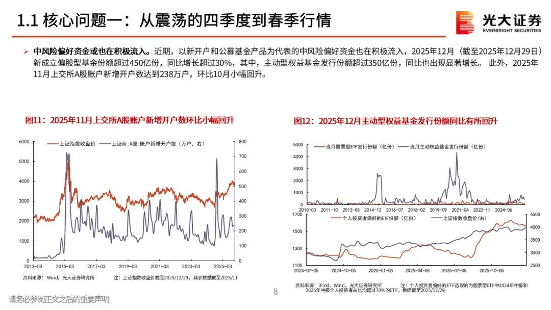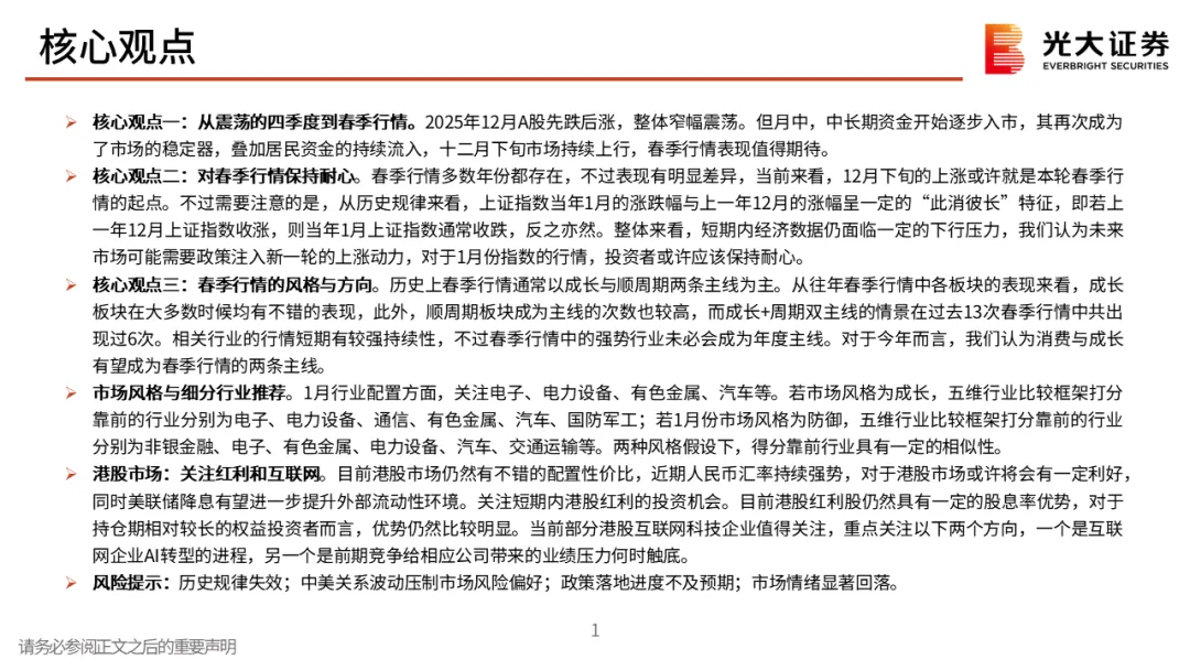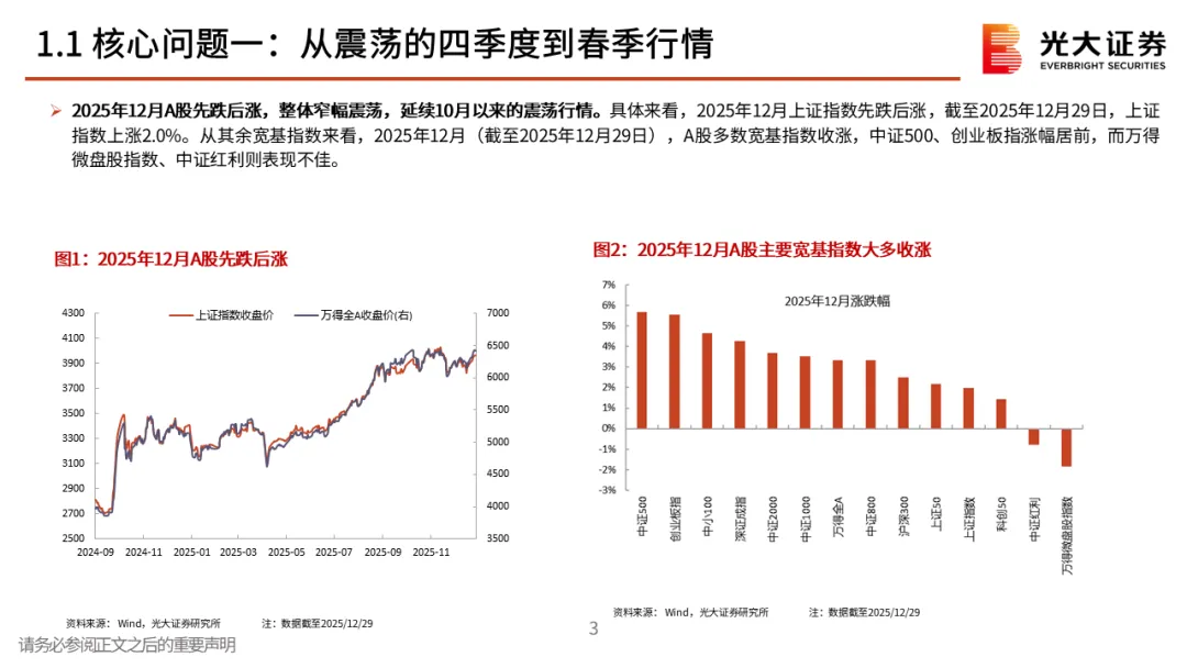 核心观点一:从震荡的四季度到春季行情。2025年12月A股先跌后涨,整体窄幅震荡。但月中,中长期资金开始逐步入市,其再次成为了市场的稳定器,叠加居民资金的持续流入,十二月下旬市场持续上行,春季行情表现值得期待。