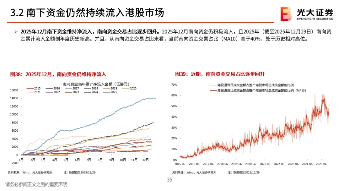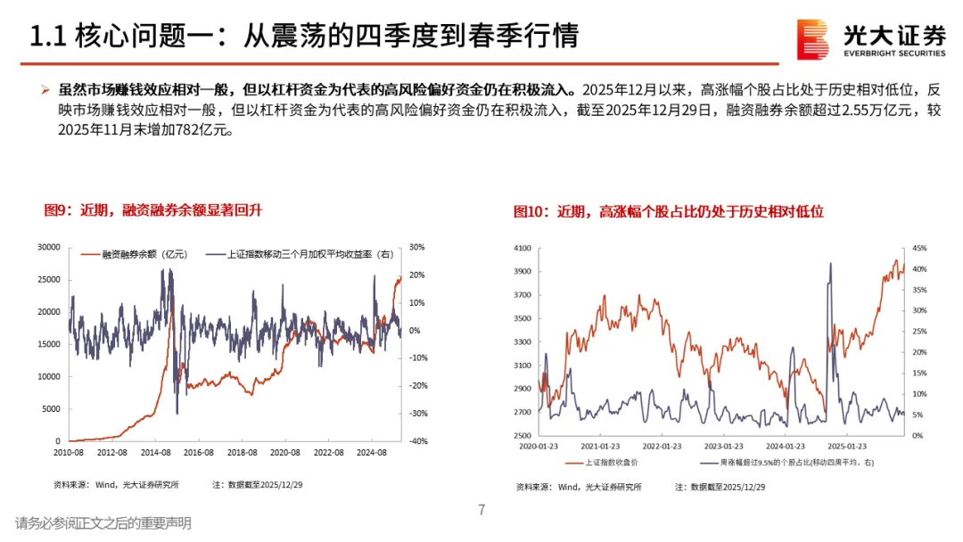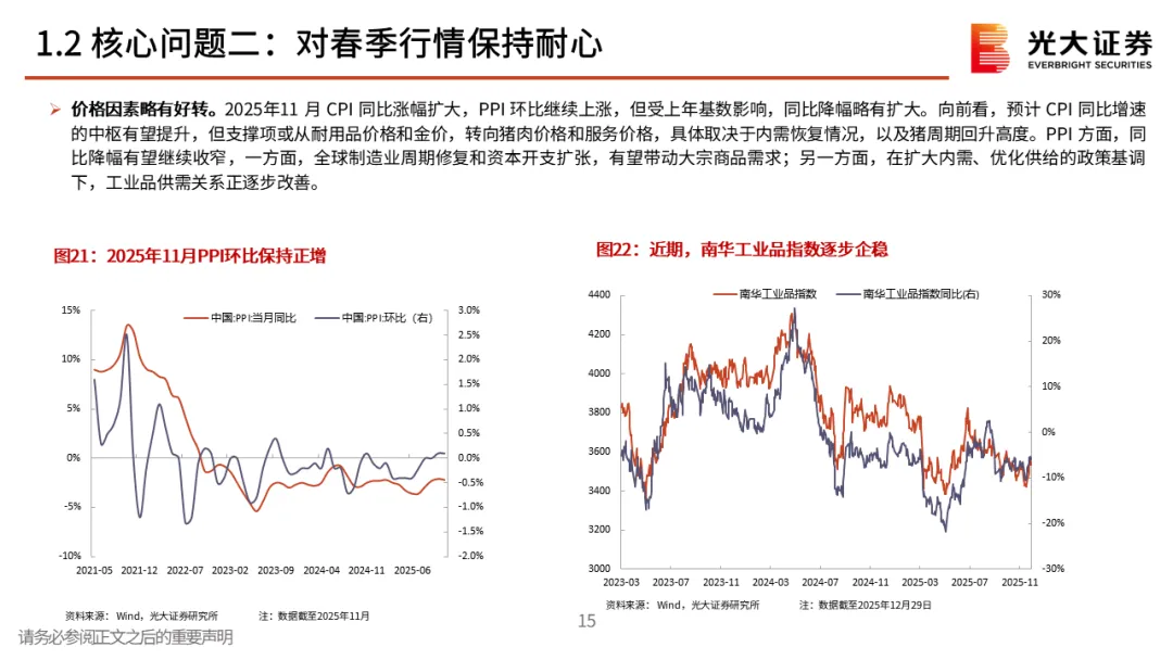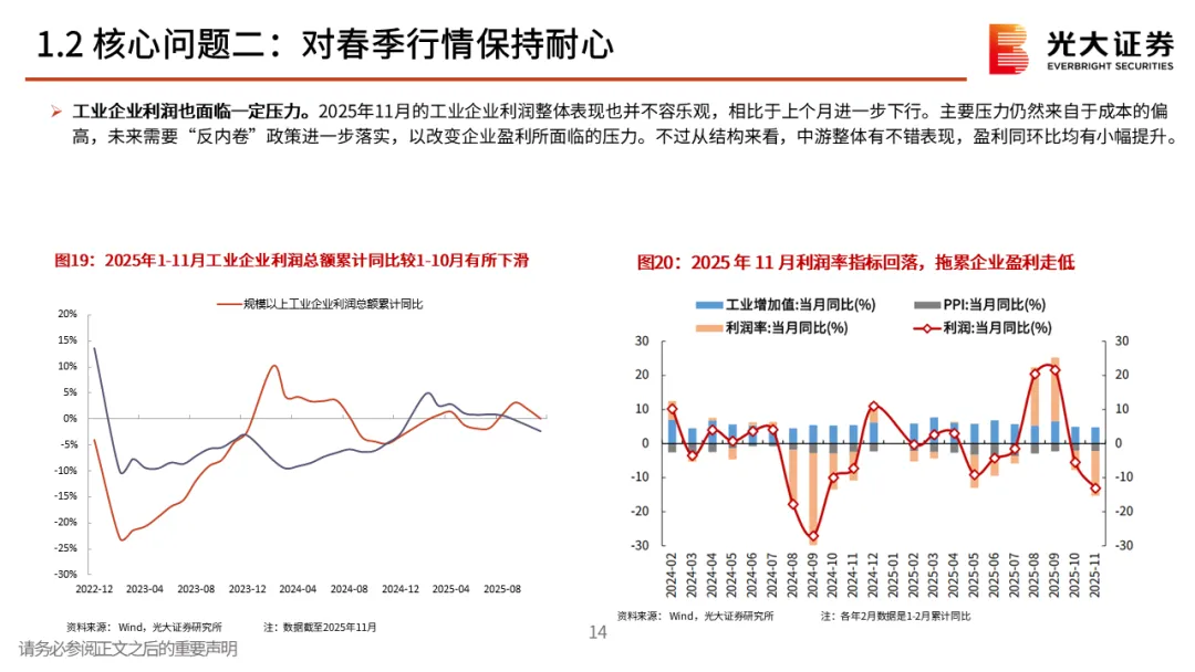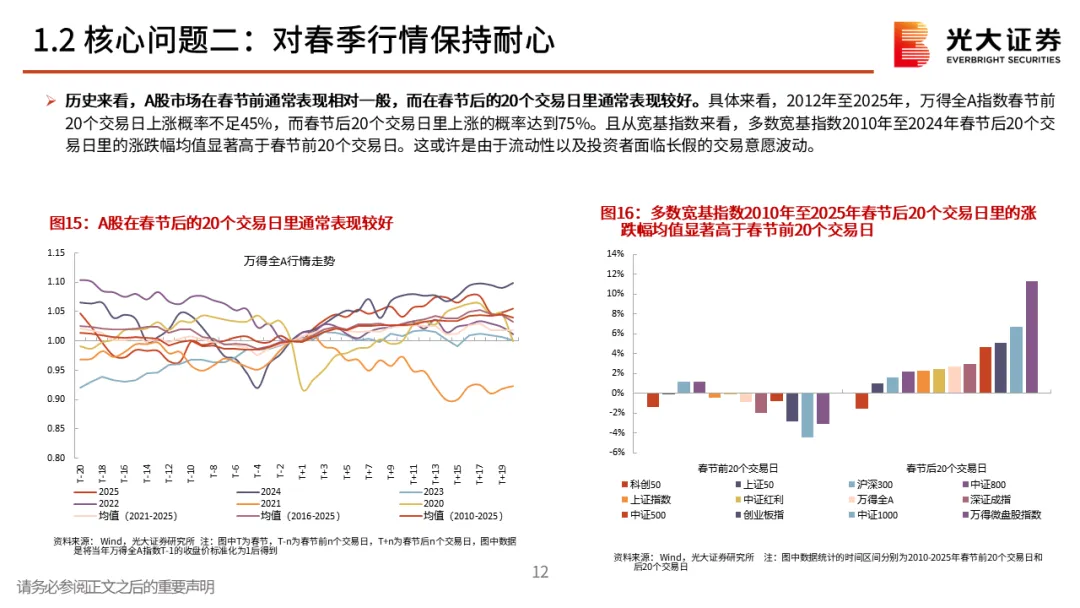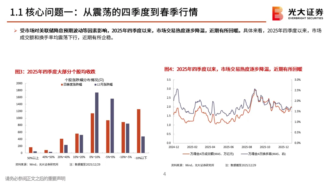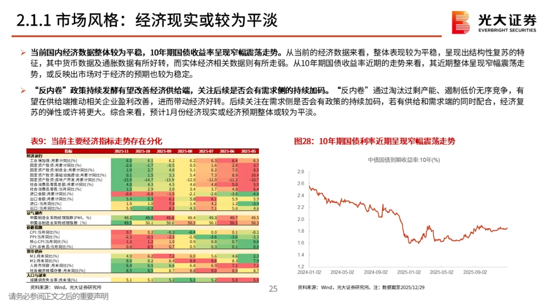 核心观点一:从震荡的四季度到春季行情。2025年12月A股先跌后涨,整体窄幅震荡。但月中,中长期资金开始逐步入市,其再次成为了市场的稳定器,叠加居民资金的持续流入,十二月下旬市场持续上行,春季行情表现值得期待。