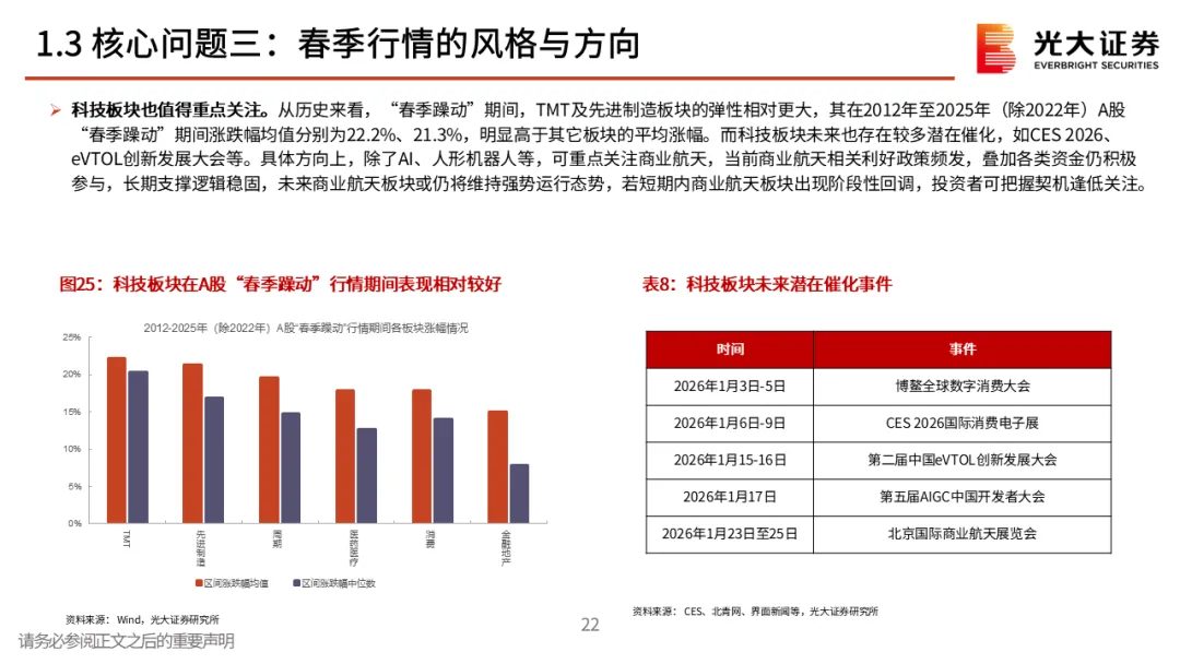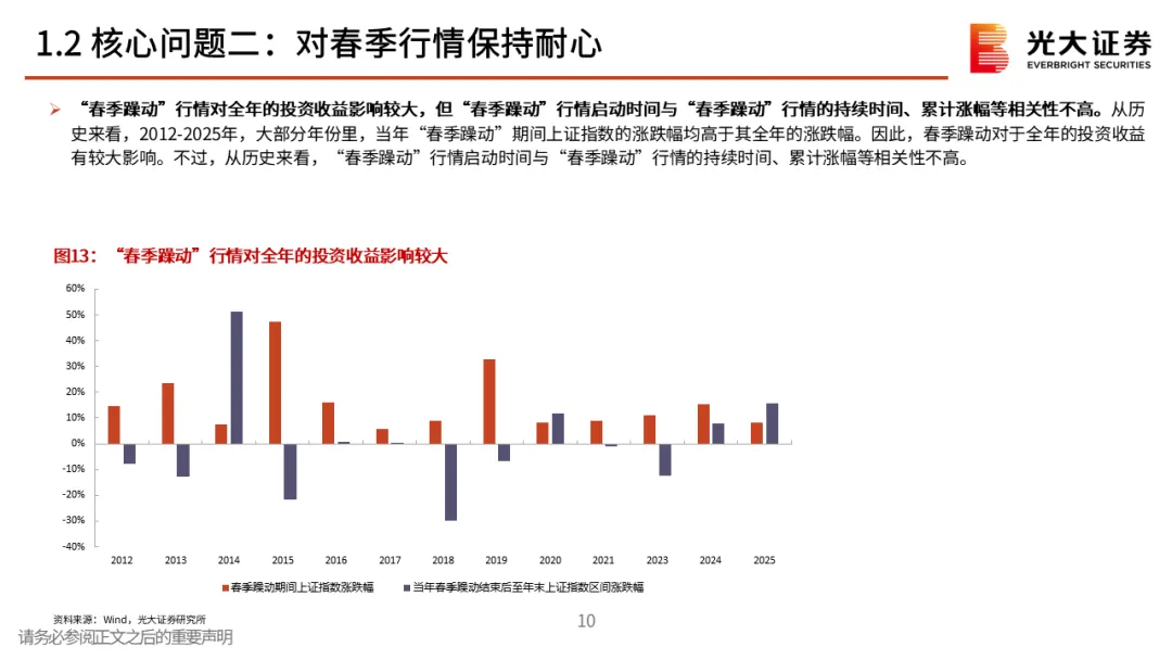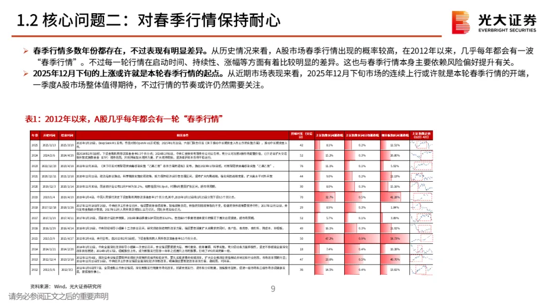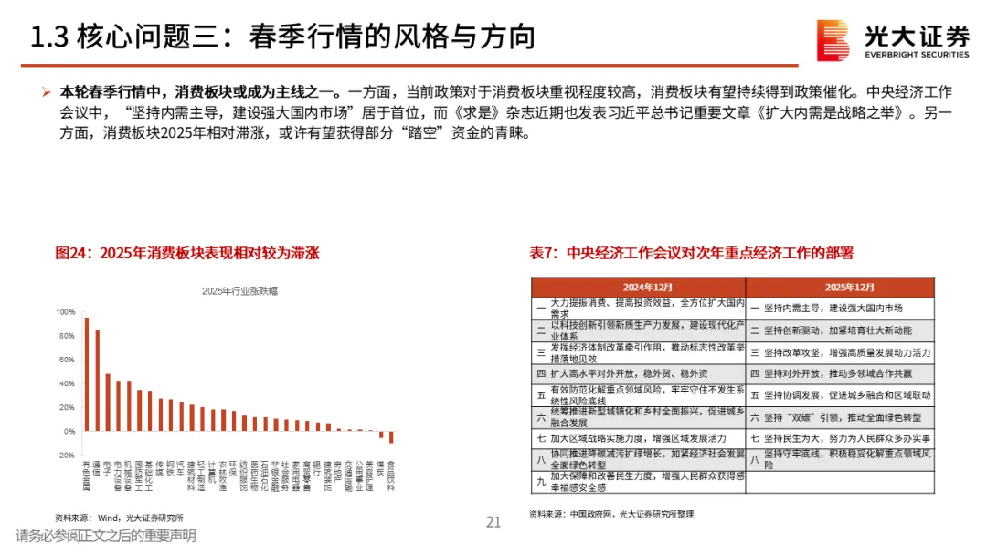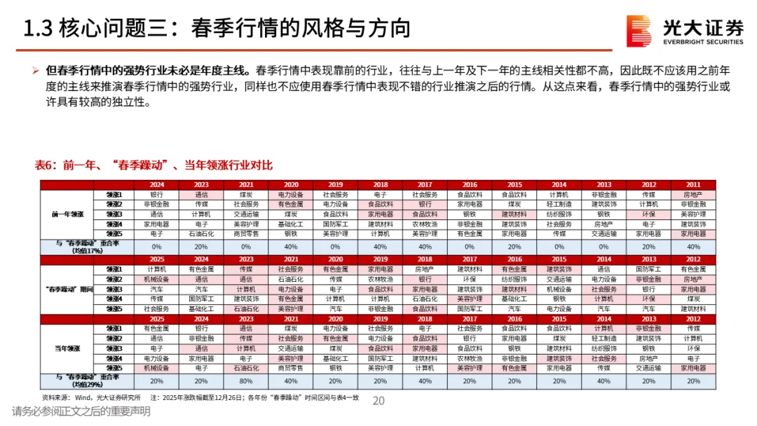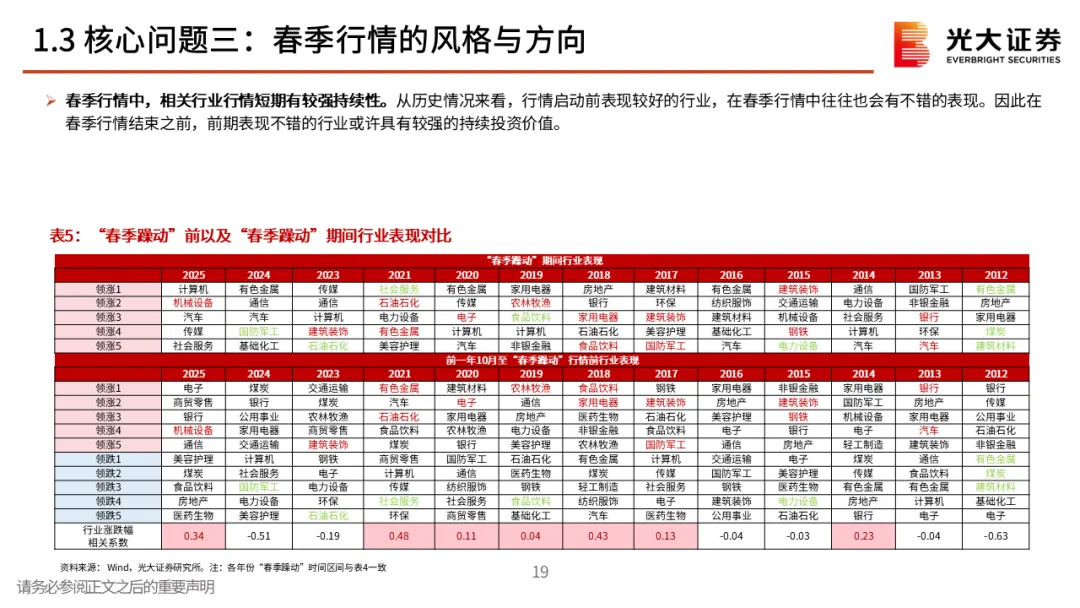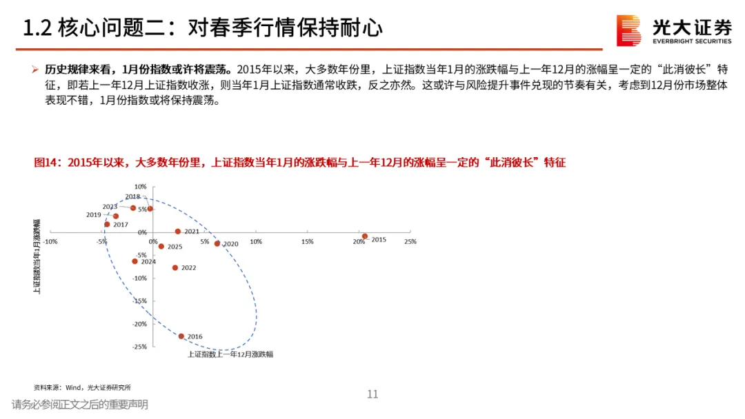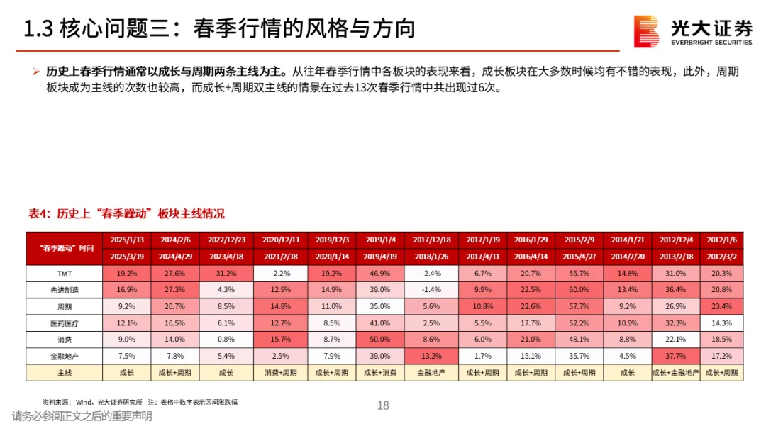 核心观点二:对春季行情保持耐心。春季行情多数年份都存在,不过表现有明显差异,当前来看,12月下旬的上涨或许就是本轮春季行情的起点。不过需要注意的是,从历史规律来看,上证指数当年1月的涨跌幅与上一年12月的涨幅呈一定的“此消彼长”特征,即若上一年12月上证指数收涨,则当年1月上证指数通常收跌,反之亦然。整体来看,短期内经济数据仍面临一定的下行压力,我们认为未来市场可能需要政策注入新一轮的上涨动力,对于1月份指数的行情,投资者或许应该保持耐心。核心观点三:春季行情的风格与方向。历史上春季行情通常以成长与顺周期两条主线为主。从往年春季行情中各板块的表现来看,成长板块在大多数时候均有不错的表现,此外,顺周期板块成为主线的次数也较高,而成长+周期双主线的情景在过去13次春季行情中共出现过6次。相关行业的行情短期有较强持续性,不过春季行情中的强势行业未必会成为年度主线。对于今年而言,我们认为消费与成长有望成为春季行情的两条主线。