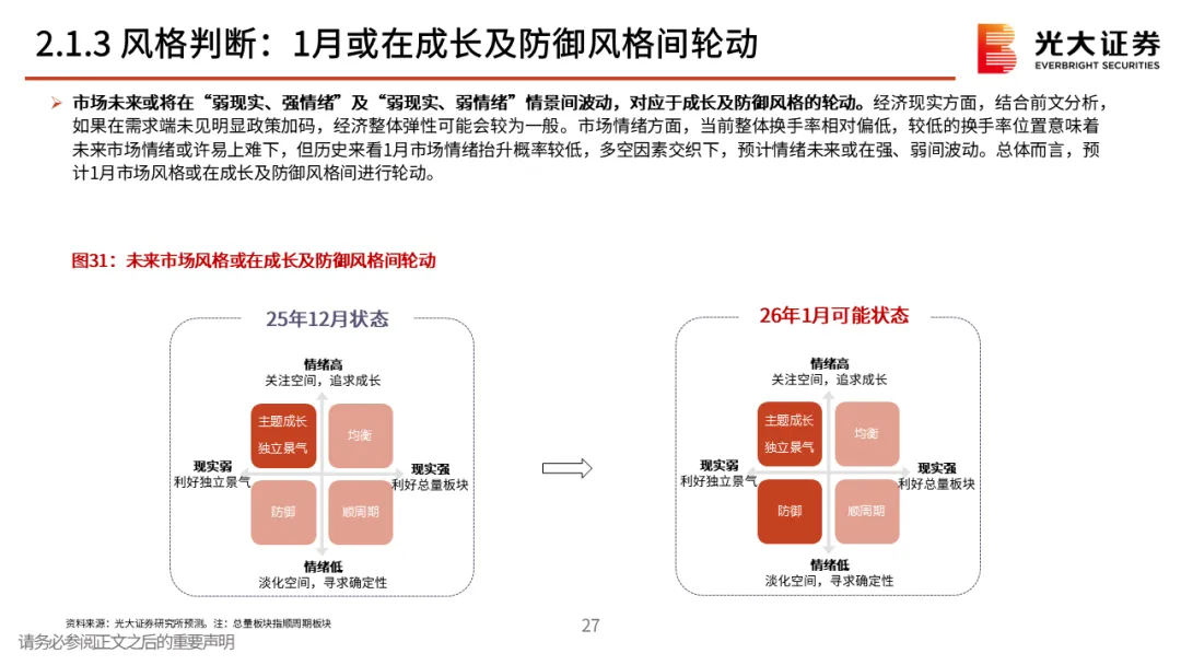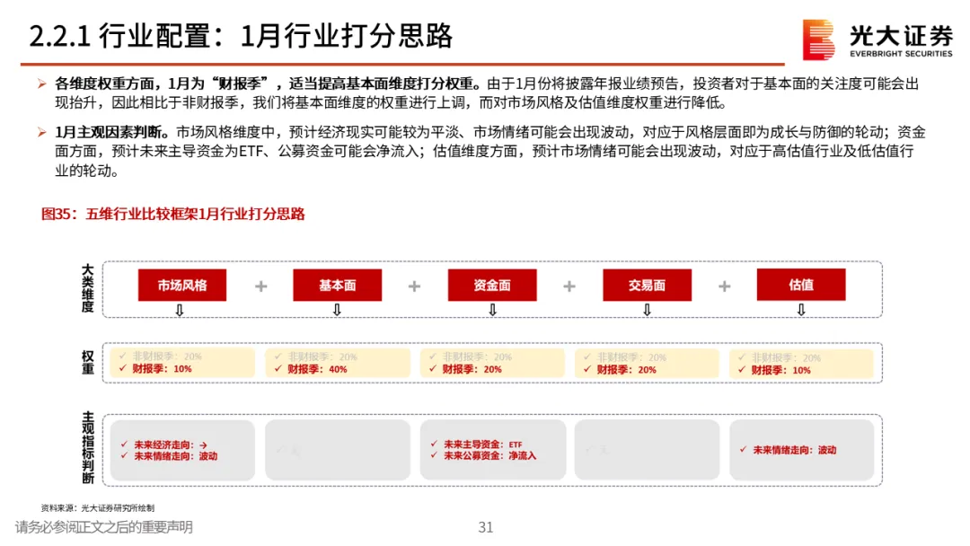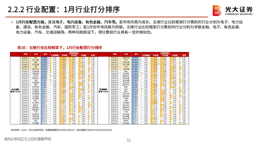 市场风格与细分行业推荐。1月行业配置方面,关注电子、电力设备、有色金属、汽车等。若市场风格为成长,五维行业比较框架打分靠前的行业分别为电子、电力设备、通信、有色金属、汽车、国防军工;若1月份市场风格为防御,五维行业比较框架打分靠前的行业分别为非银金融、电子、有色金属、电力设备、汽车、交通运输等。两种风格假设下,得分靠前行业具有一定的相似性。