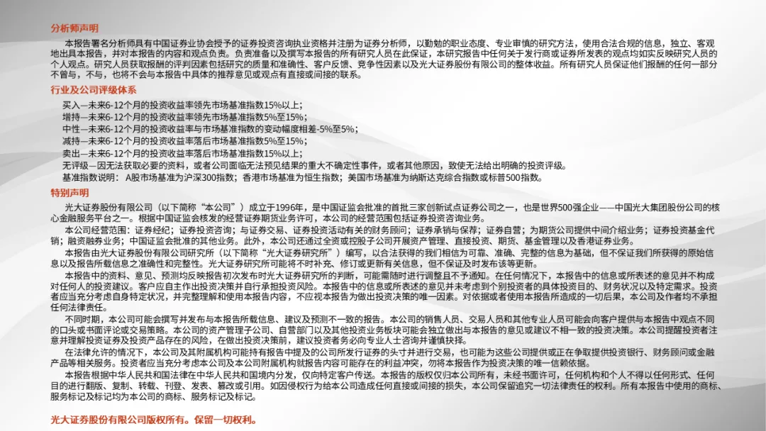 本订阅号所刊载的信息均基于光大证券研究所已正式发布的研究报告,仅供在新媒体形势下研究信息、研究观点的及时沟通交流,其中的资料、意见、预测等,均反映相关研究报告初次发布当日光大证券研究所的判断,可能需随时进行调整,本订阅号不承担更新推送信息或另行通知的义务。如需了解详细的证券研究信息,请具体参见光大证券研究所发布的完整报告。