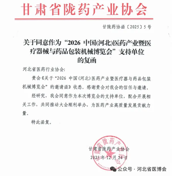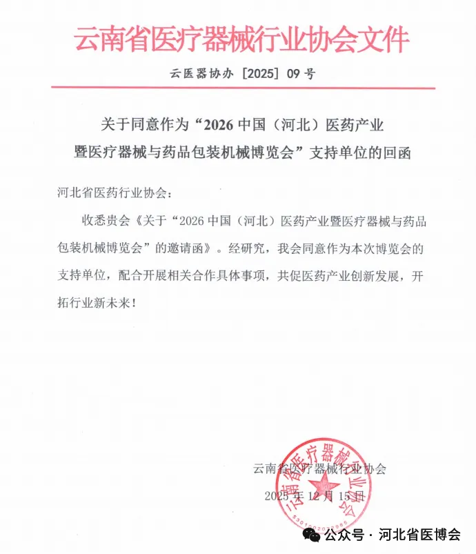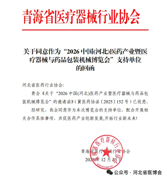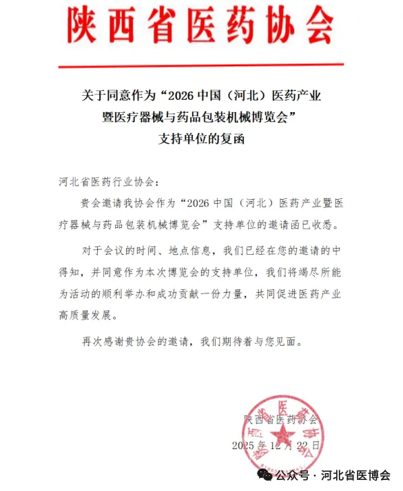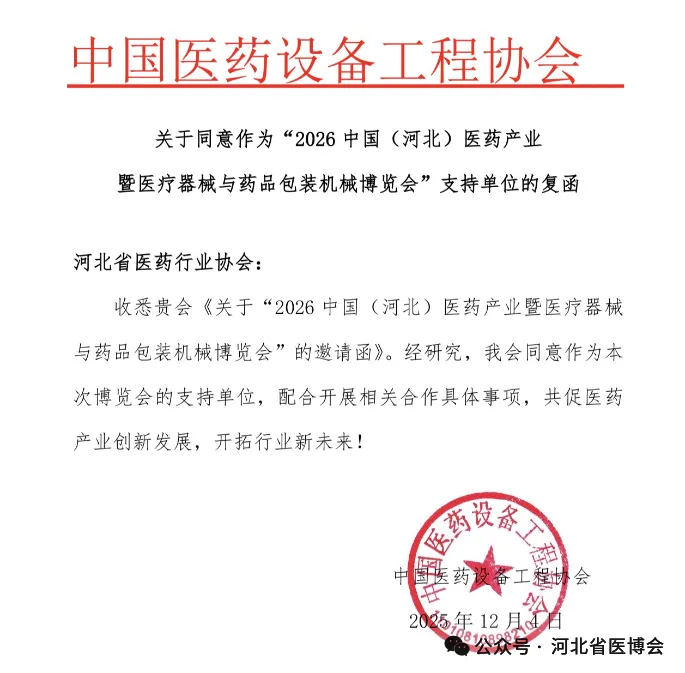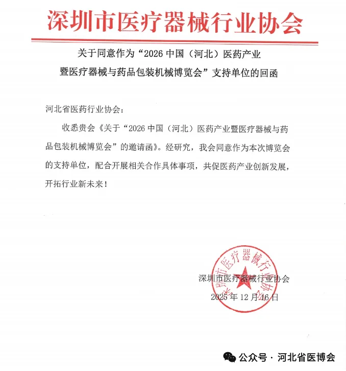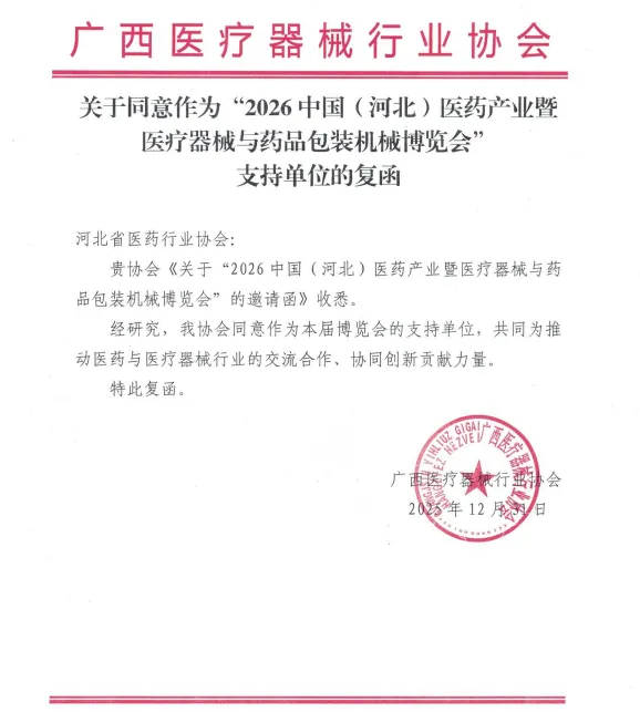 广西医疗器械行业协会 关于同意作为“2026 中国(河北)医药产业暨医疗器械与药品包装机械博览会”支持单位的复函为促进河北省医药健康发展,推动市场深化交流、商贸合作、医药行业上下游产业创新链衔接,助力我省医药产业新质生产力快速发展,河北省医药行业协会、北京徐成国际会展有限公司定于2026 年7月21日-23日在石家庄国际会展中心(正定新馆)在2026年联合举办“2026 中国(河北)医药产业暨医疗器械与药品包装机械博览会”(简称:河北省医博会)。本次博览会是连通中外医药产业融合发展的重要契机。欢迎行业内外相关单位及人员参展、参会。感谢相关行业协会的鼎力支持,