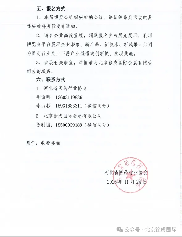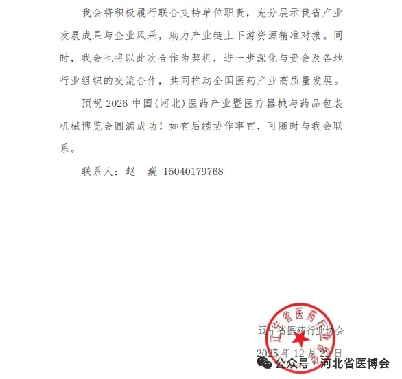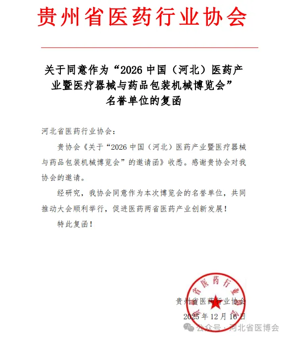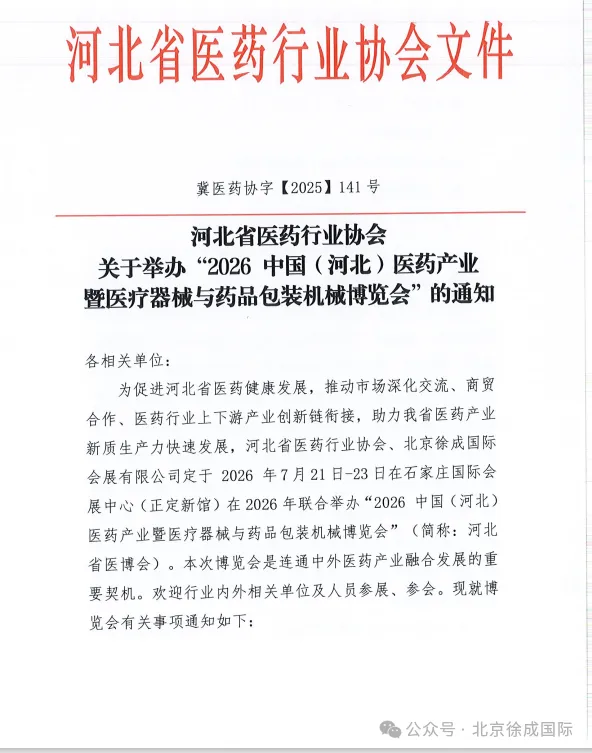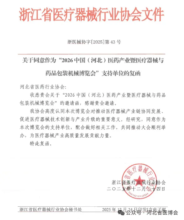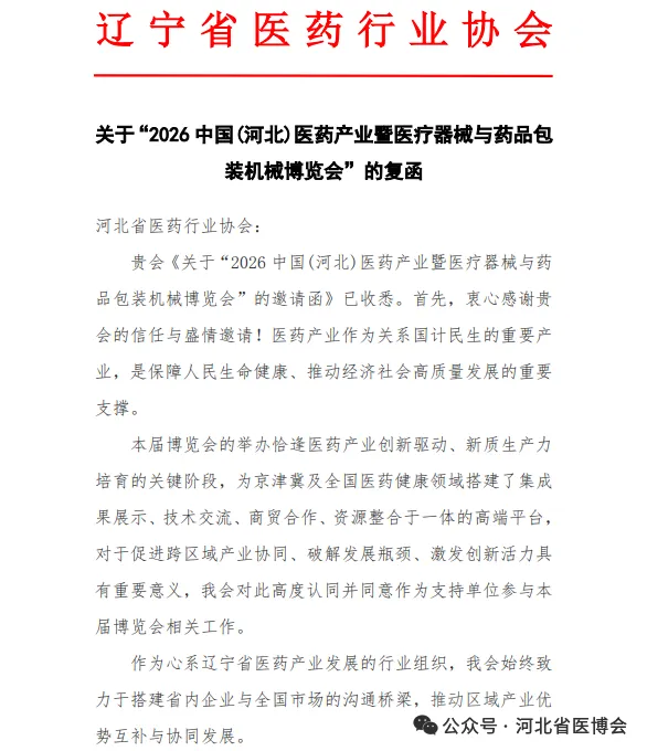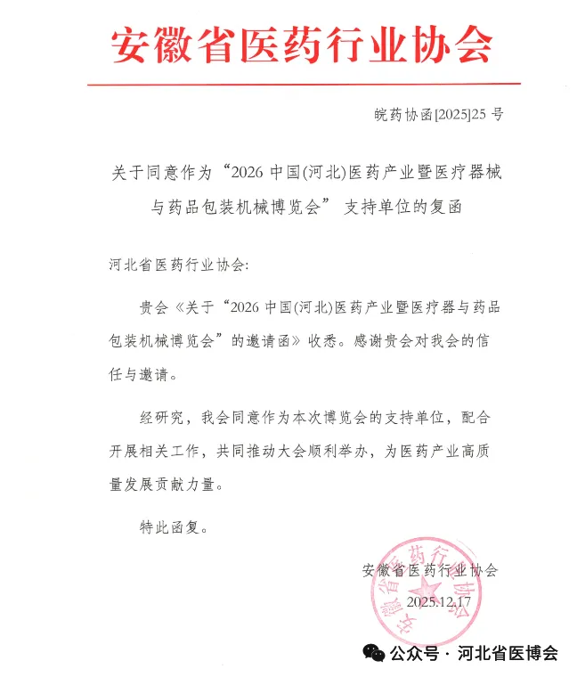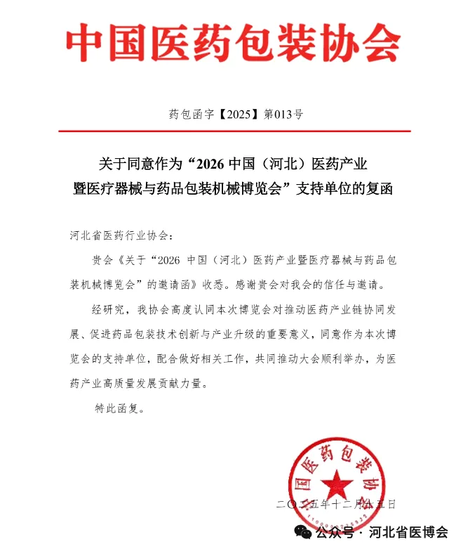 广西医疗器械行业协会 关于同意作为“2026 中国(河北)医药产业暨医疗器械与药品包装机械博览会”支持单位的复函为促进河北省医药健康发展,推动市场深化交流、商贸合作、医药行业上下游产业创新链衔接,助力我省医药产业新质生产力快速发展,河北省医药行业协会、北京徐成国际会展有限公司定于2026 年7月21日-23日在石家庄国际会展中心(正定新馆)在2026年联合举办“2026 中国(河北)医药产业暨医疗器械与药品包装机械博览会”(简称:河北省医博会)。本次博览会是连通中外医药产业融合发展的重要契机。欢迎行业内外相关单位及人员参展、参会。感谢相关行业协会的鼎力支持,