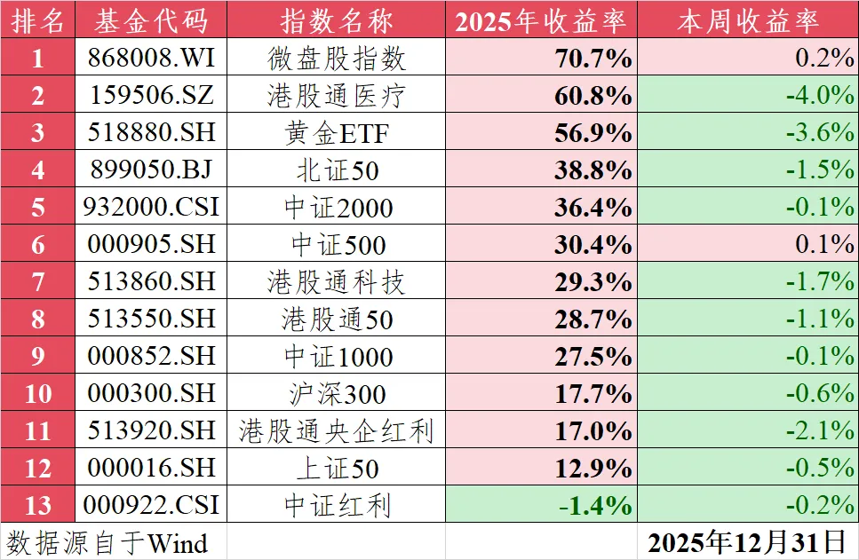 年度最后一周,本周微盘指数继续上涨,涨幅0.2%,同时港股通医疗本周继续暴跌4.0%;年度收益率榜单中,微盘股指数成功反超,跃居榜首。