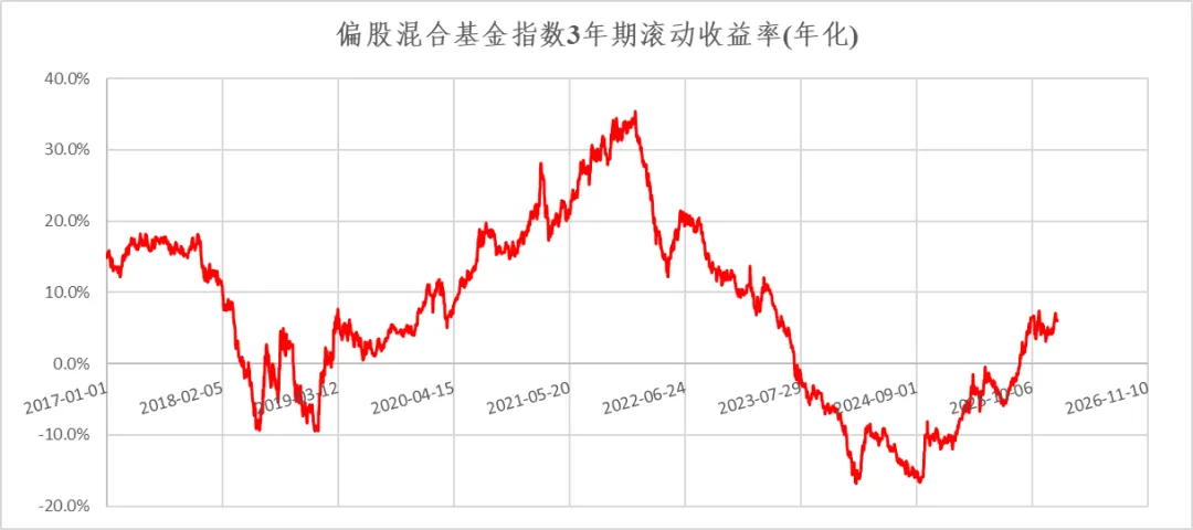 偏股混合基金指数3年期滚动年化收益率指数持续震荡,最新的数据是6.01%(2025年12月31日)。