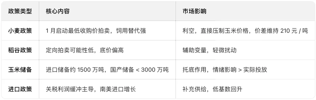 3. 政策格局:呈现“小麦主导、稻谷辅助、储备托底、进口补充”特征,政策与基本面交织决定走势。